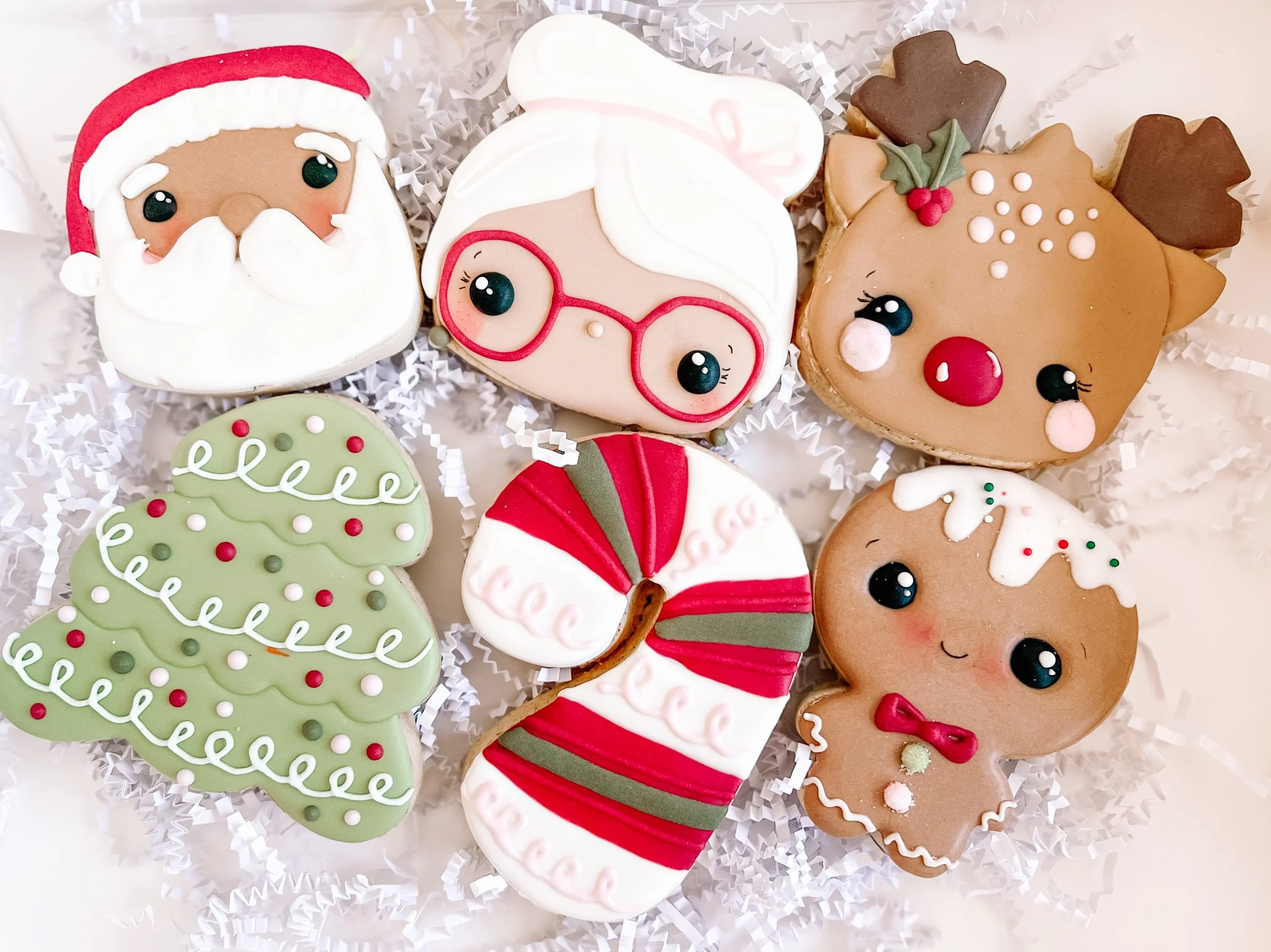 Comes with 12 vanilla bean cookies, with 6 different designs as shown (Santa, Mrs. Claus, Rudolph, candy cane, Christmas tree, and gingerbread man). Cookies will be individually heat-sealed and boxed with a bow and a tag.