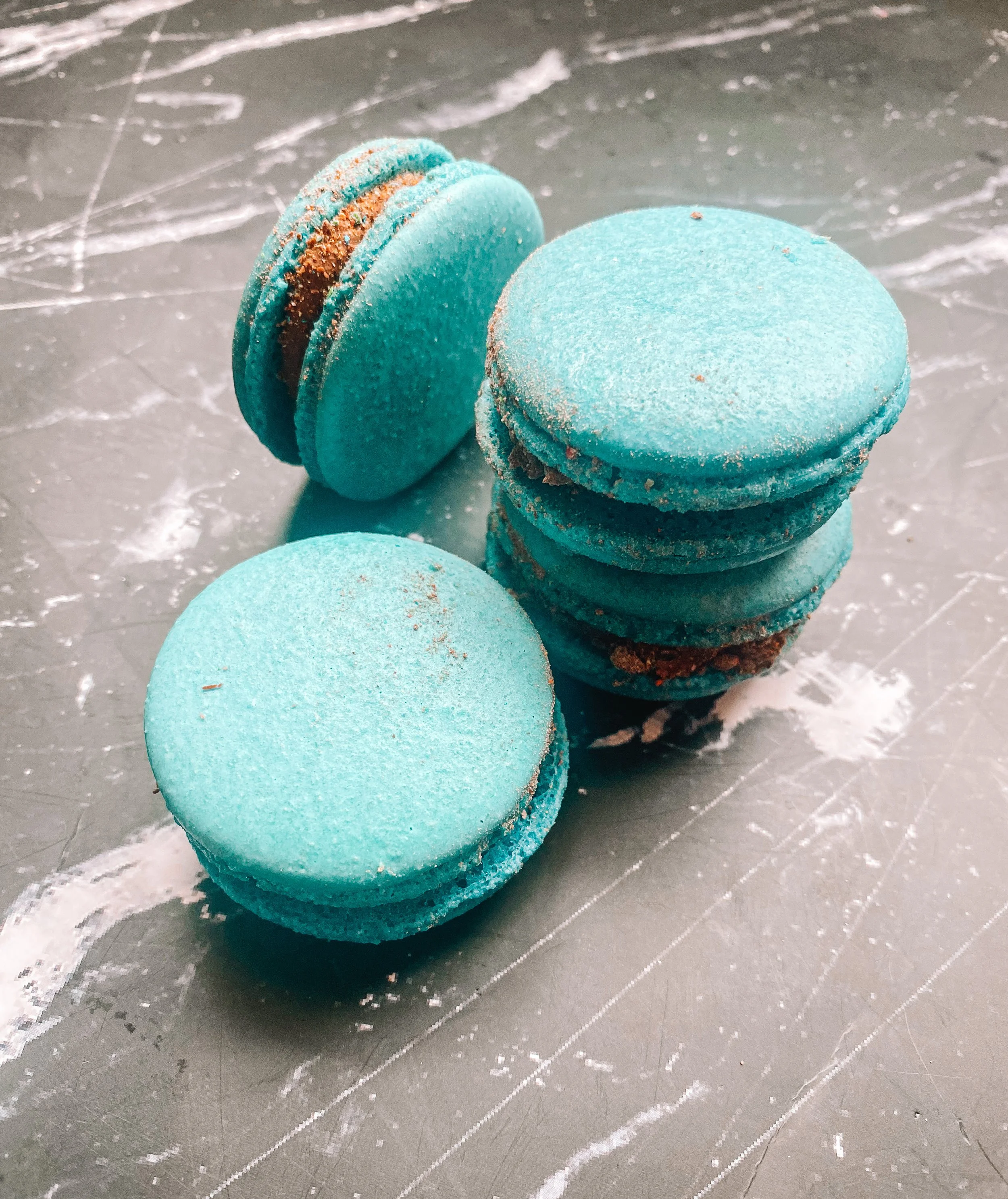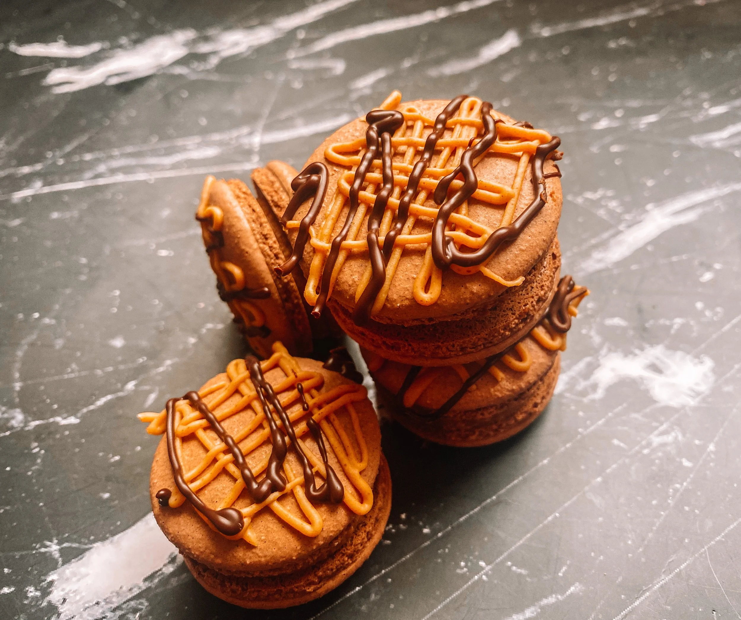 Chocolate peanut butter flavored macarons, filled with chocolate, peanut butter, and graham cracker filling.
