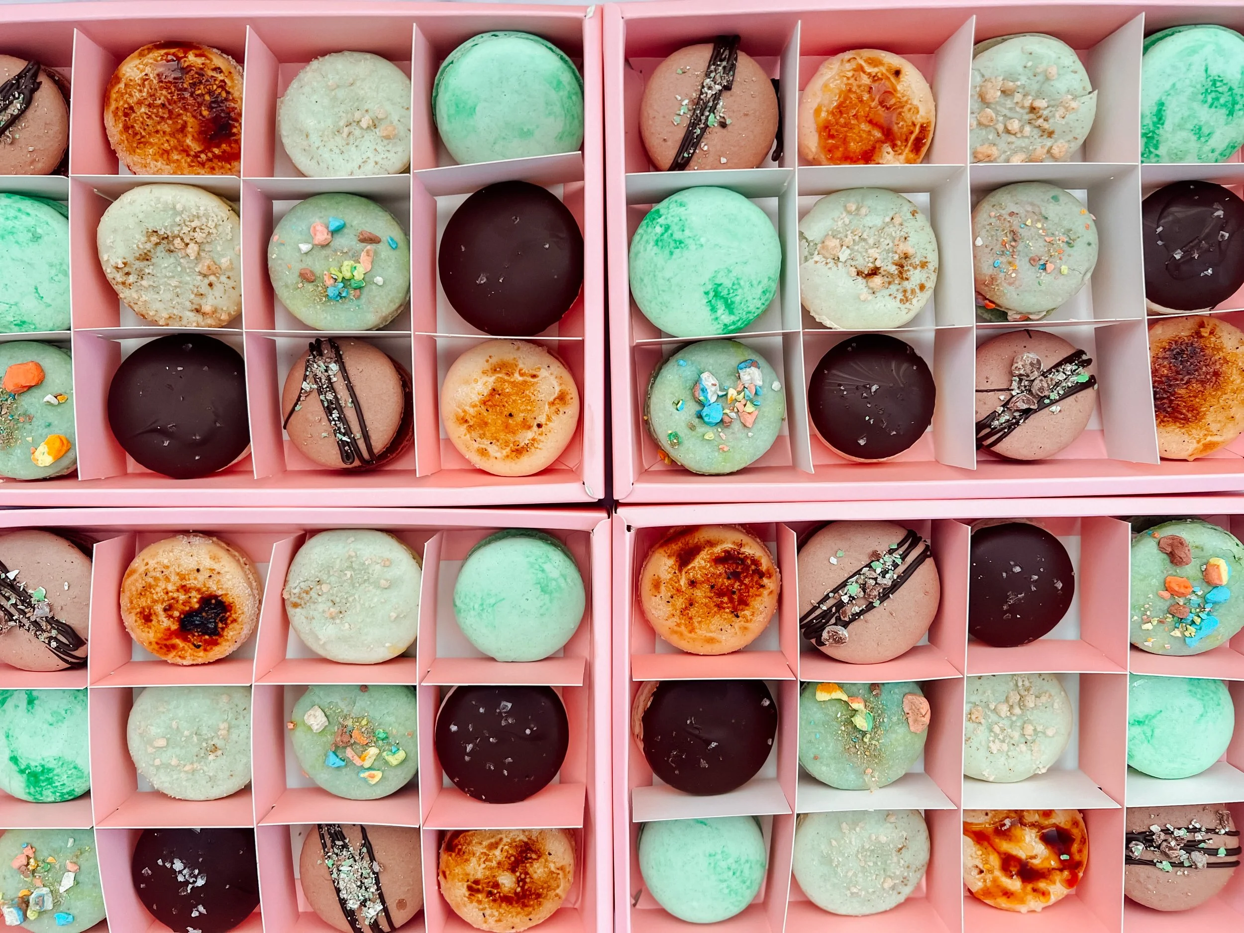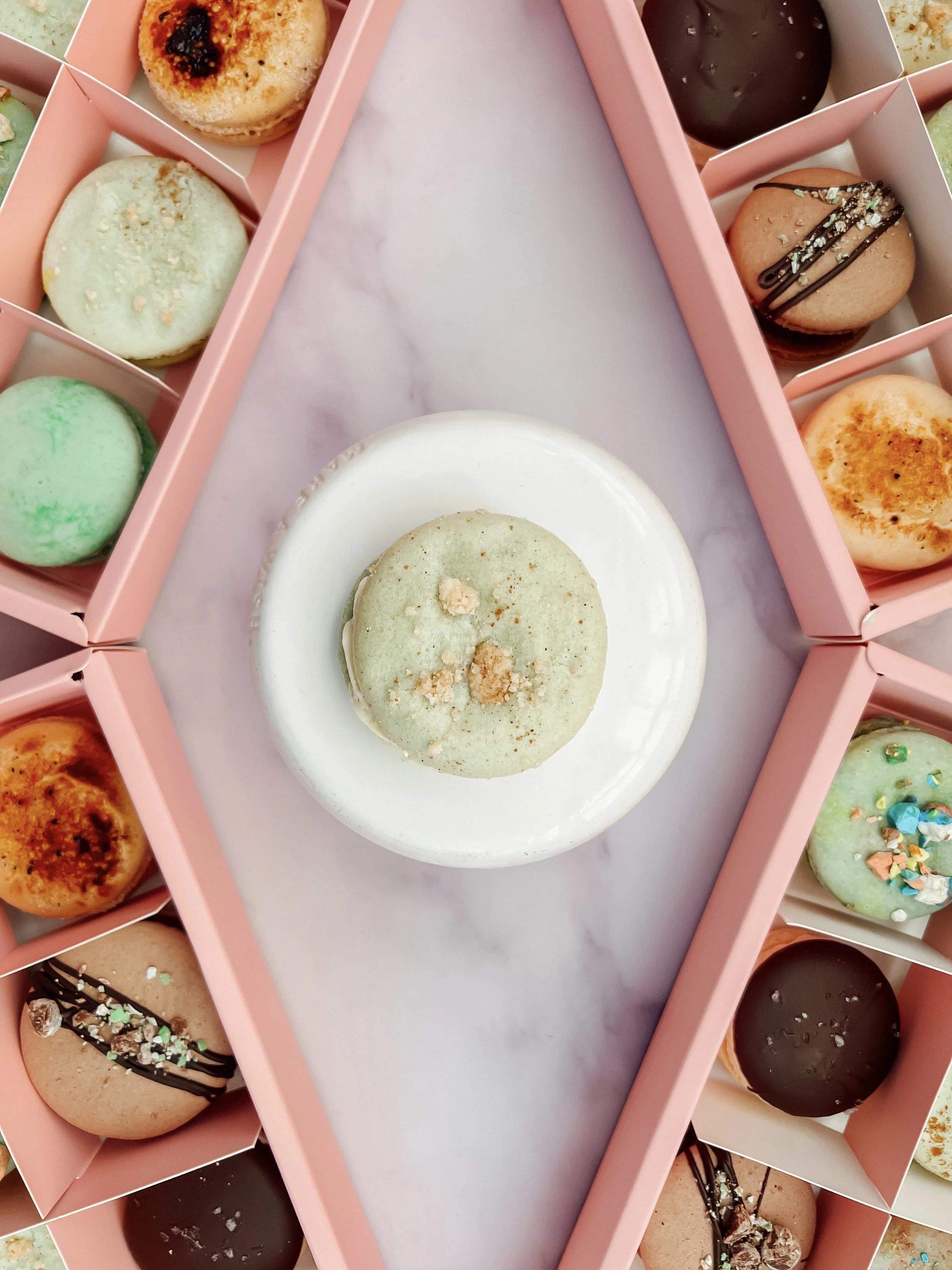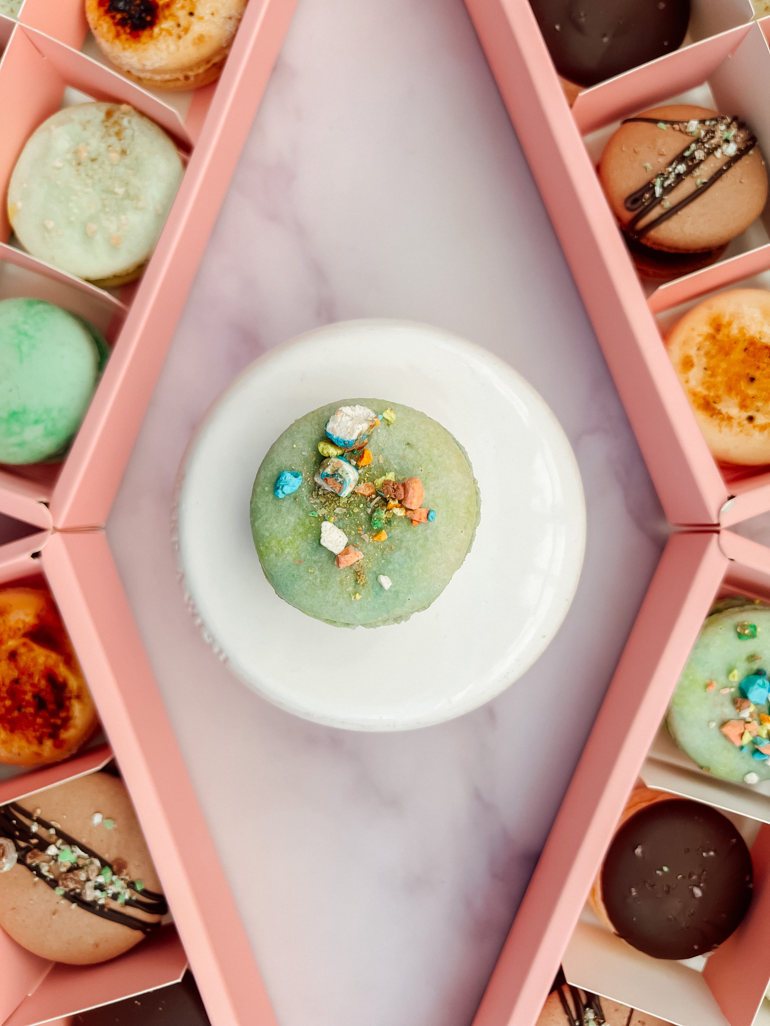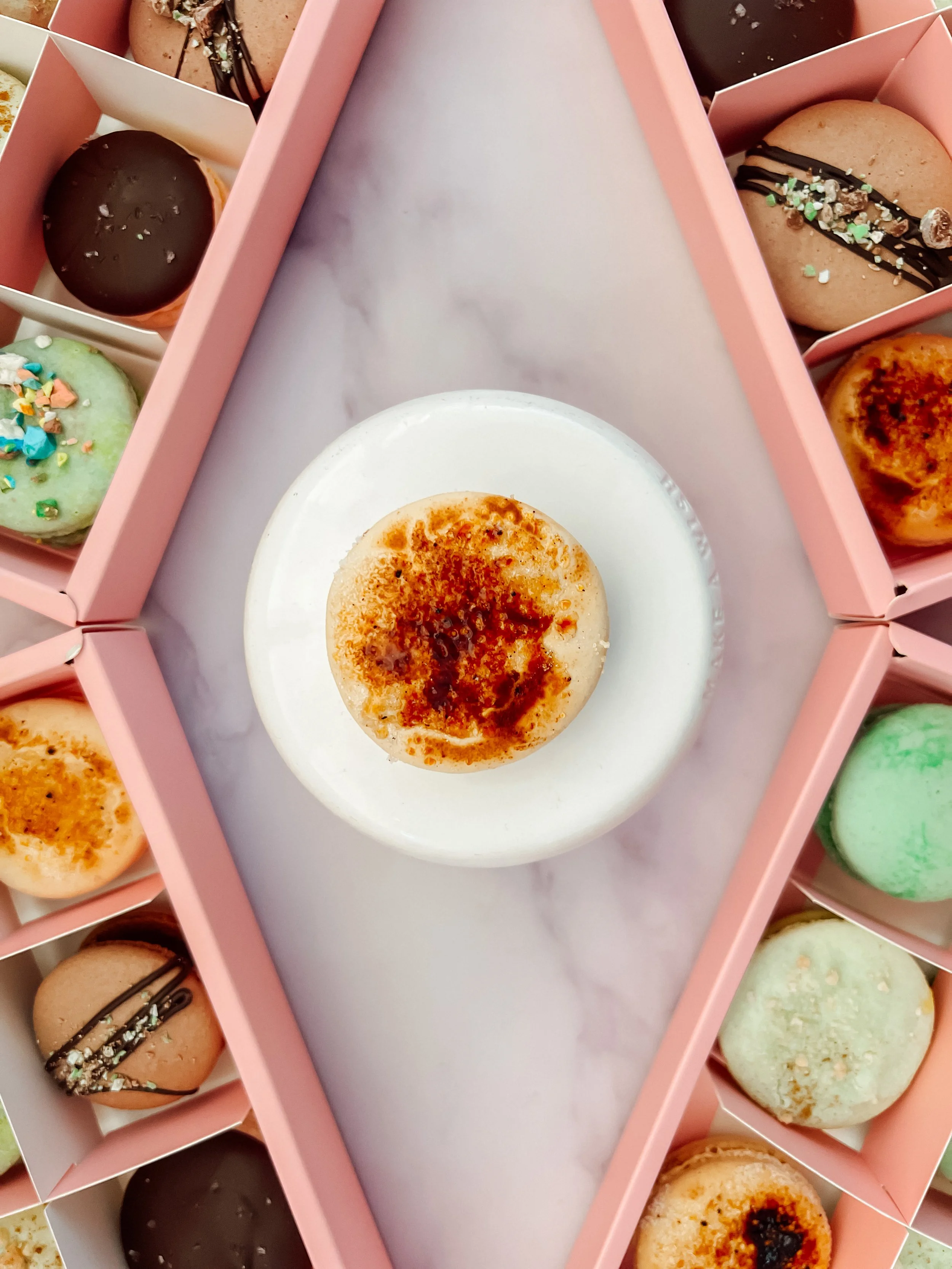 (Probably my favorite flavor this month.) Espresso flavored macarons, filled with a rich Irish crème buttercream, topped with torched vanilla sugar