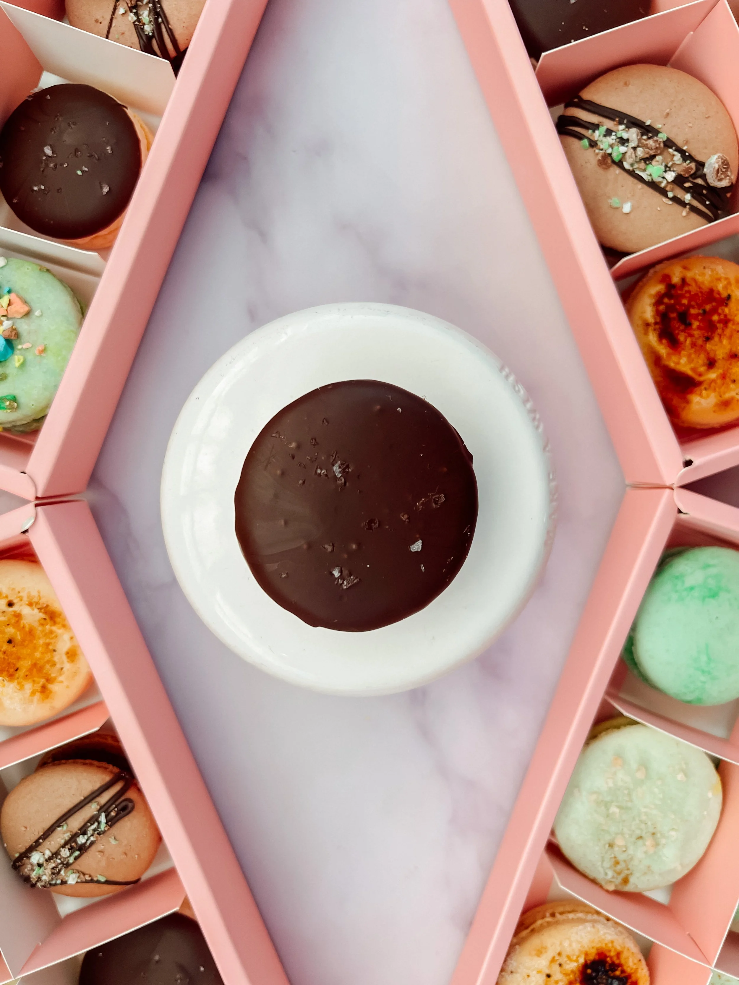Shortbread flavored macarons, filled with GF shortbread cookie butter and rich caramel, then dipped in chocolate and sprinkled with Maldon salt.