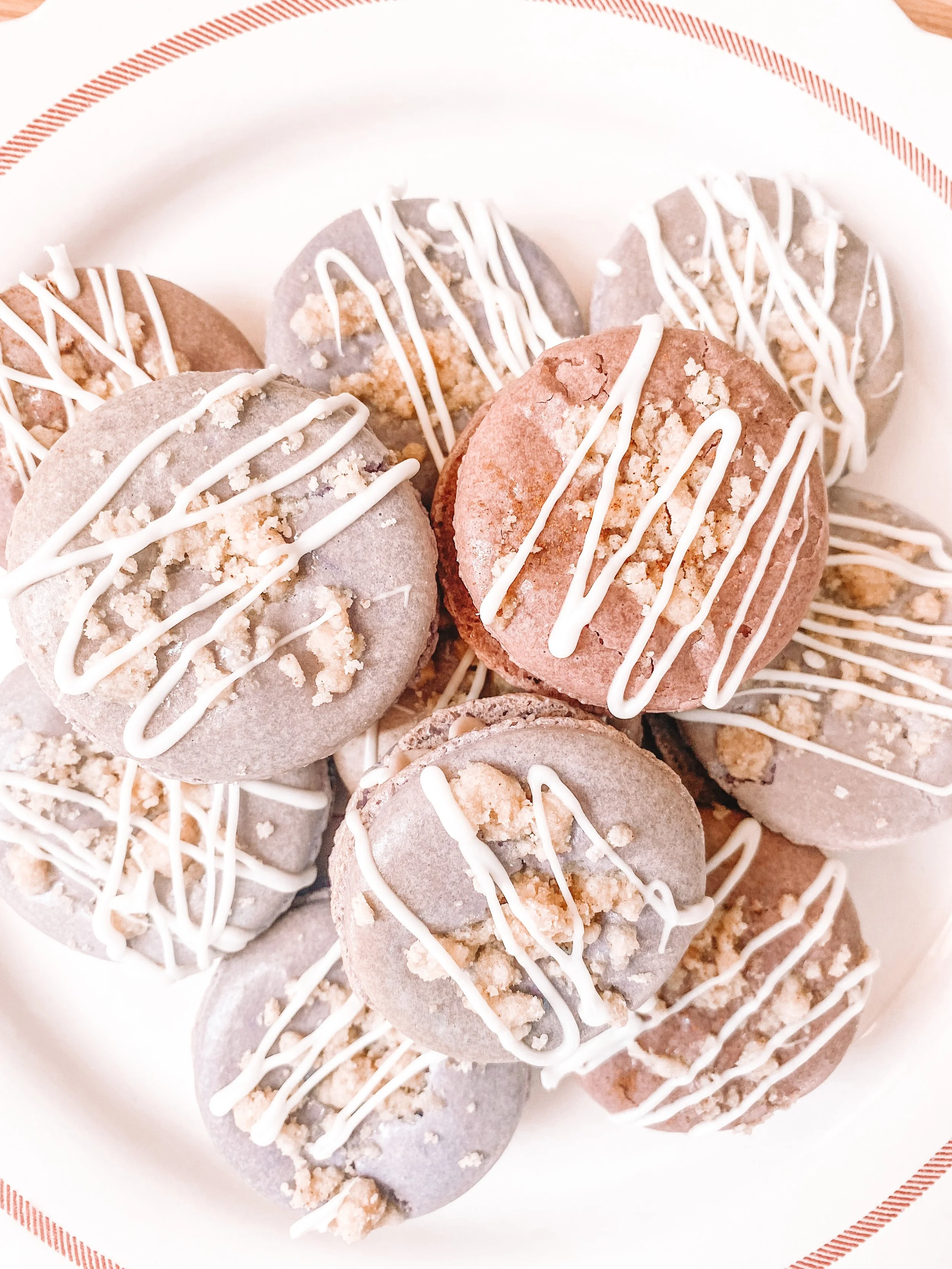Blackberry flavored macarons, baked with gluten free cinnamon streusel. Filled with blackberry-flavored white chocolate ganache.