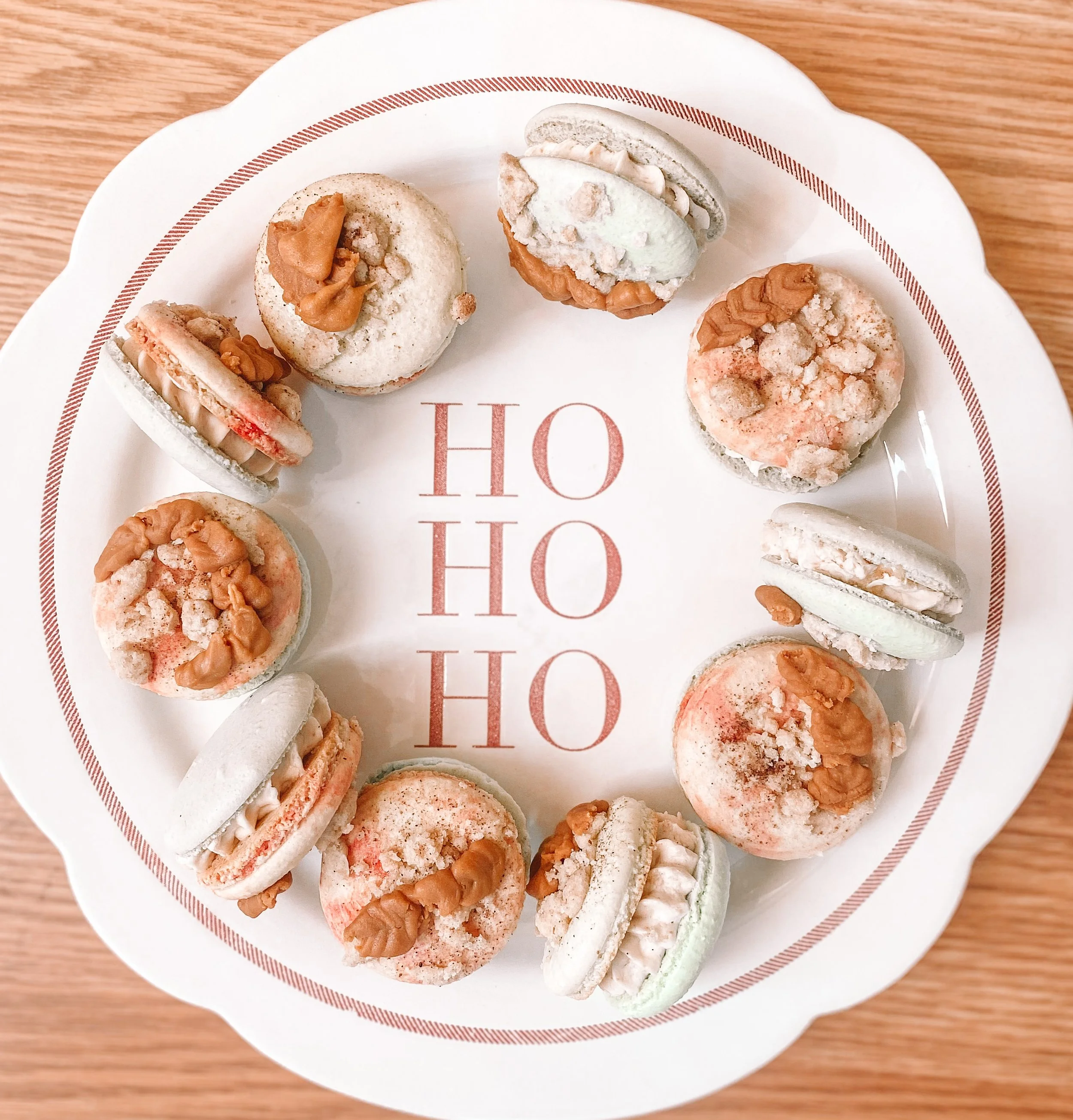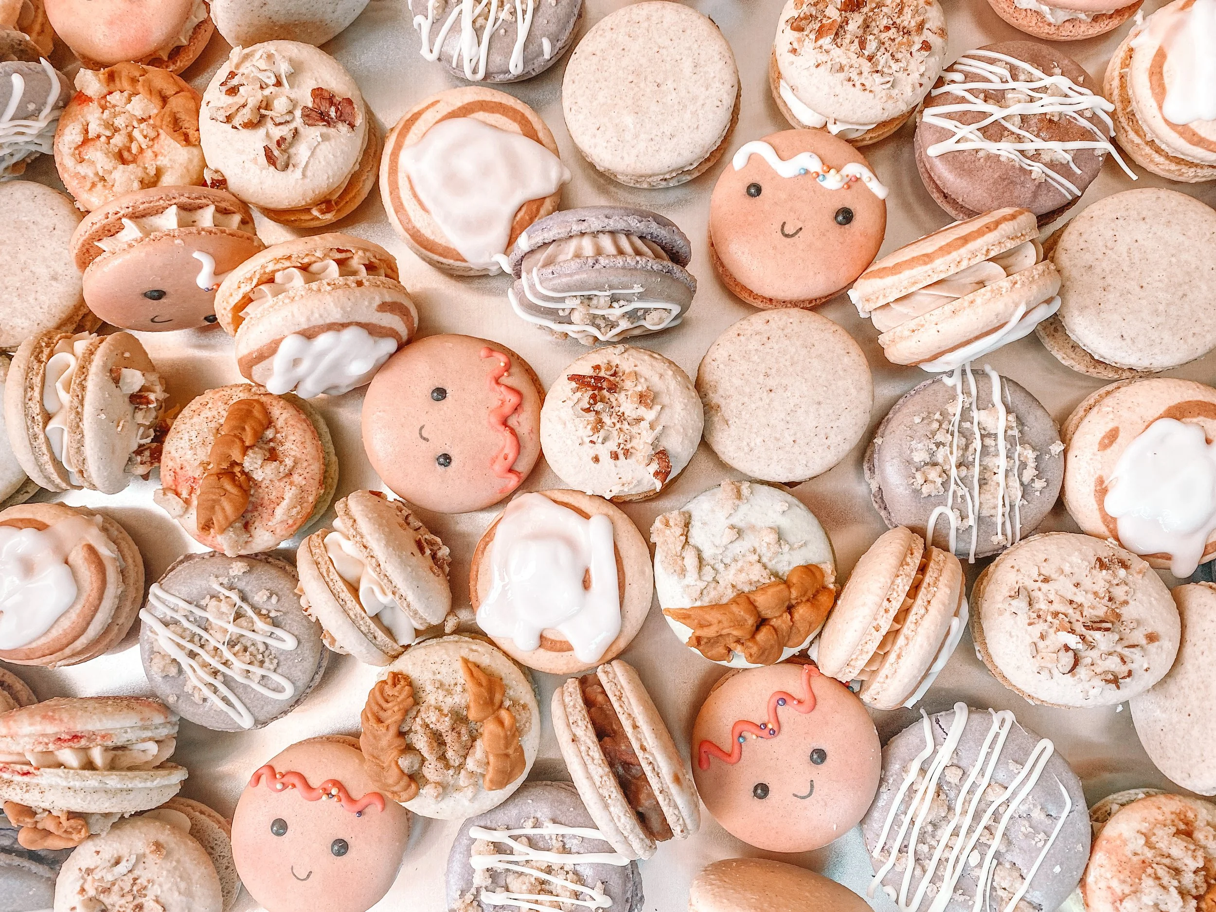 Apple flavored macarons, topped with gluten free cinnamon streusel and caramelized white chocolate leaves. Filled with salted caramel cinnamon buttercream and apple pie filling