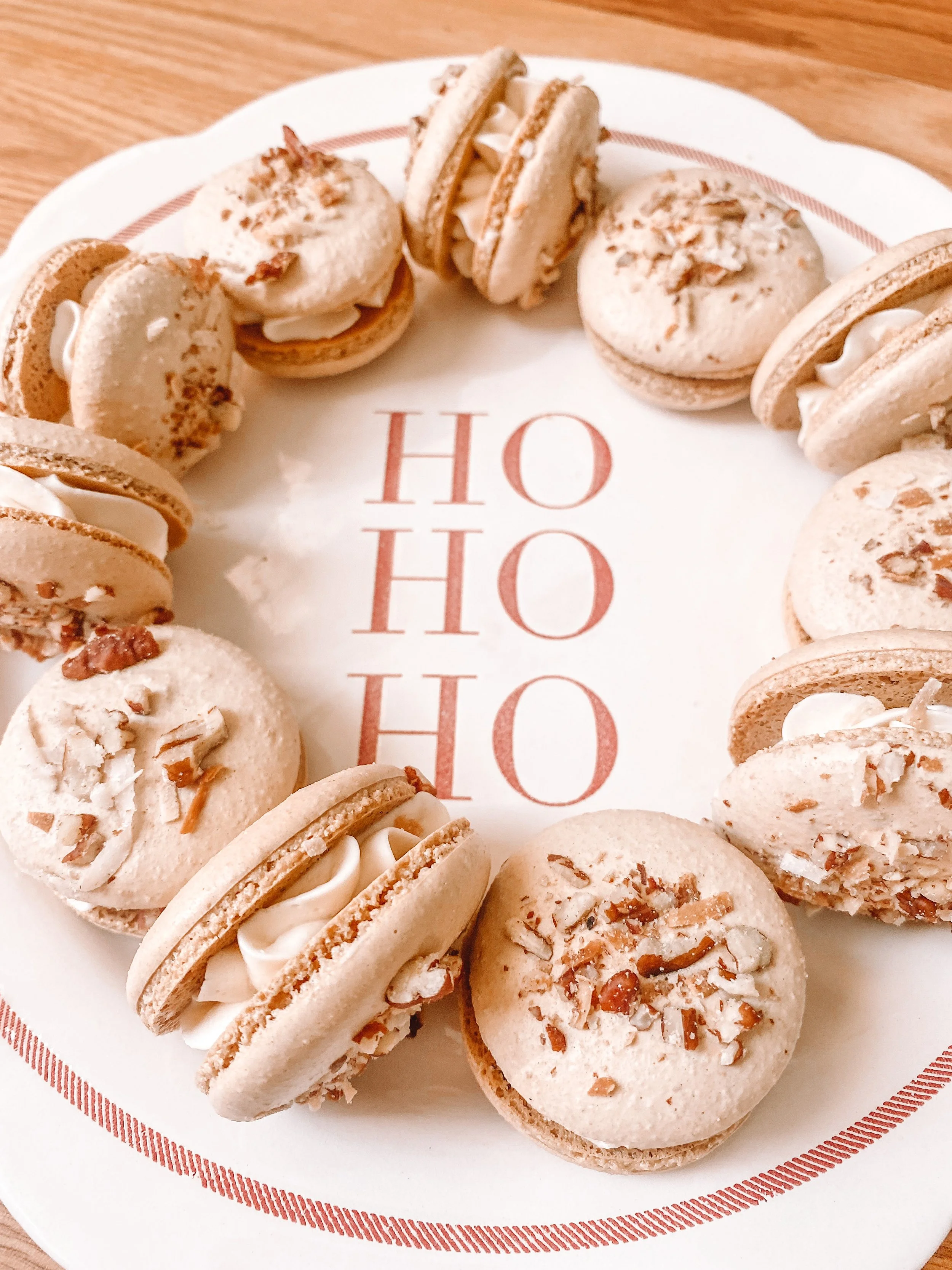 Vanilla bean espresso flavored macarons, topped with toasted coconut and pecans, filled with coconut-caramel buttercream. Inspired by the classic Barney’s Coffee flavor that used to make the shopping malls smell like a warm winter hug. 🥰