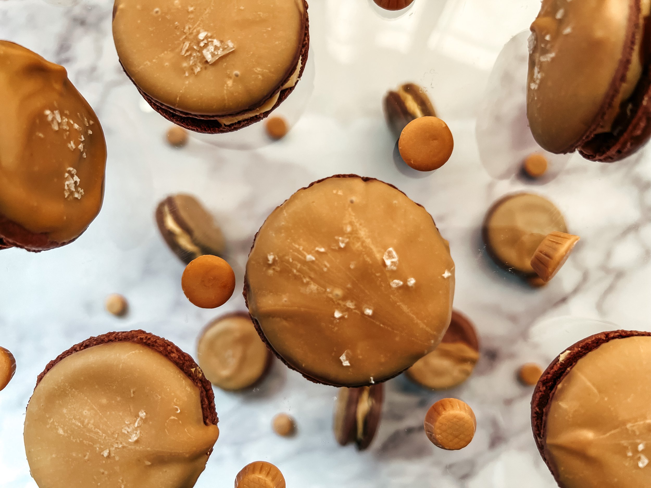 Chocolate macarons dipped in Callebaut gold chocolate, topped with a sprinkling of Maldon salt, filled with salted caramel French buttercream and chewy salted caramel