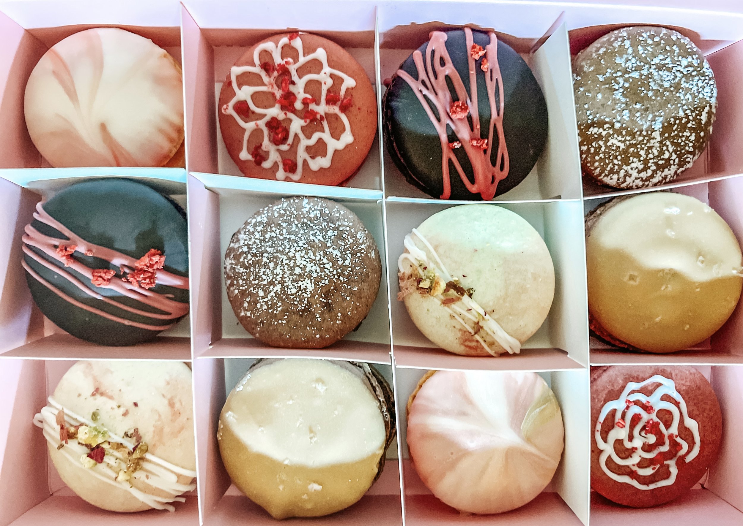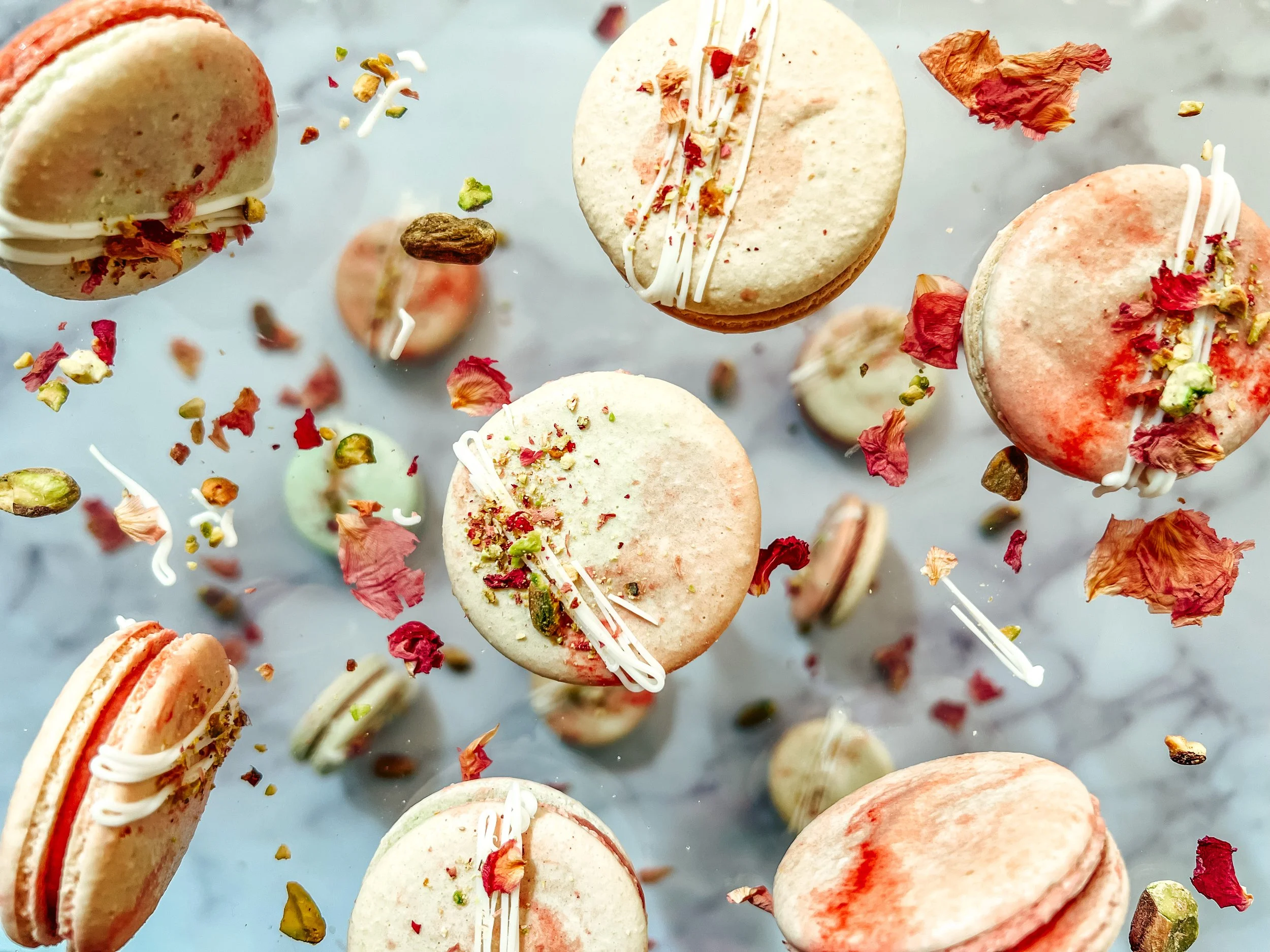 Pistachio macarons filled with rose buttercream, topped with white chocolate drizzle, crushed pistachios and dried organic rose petals
