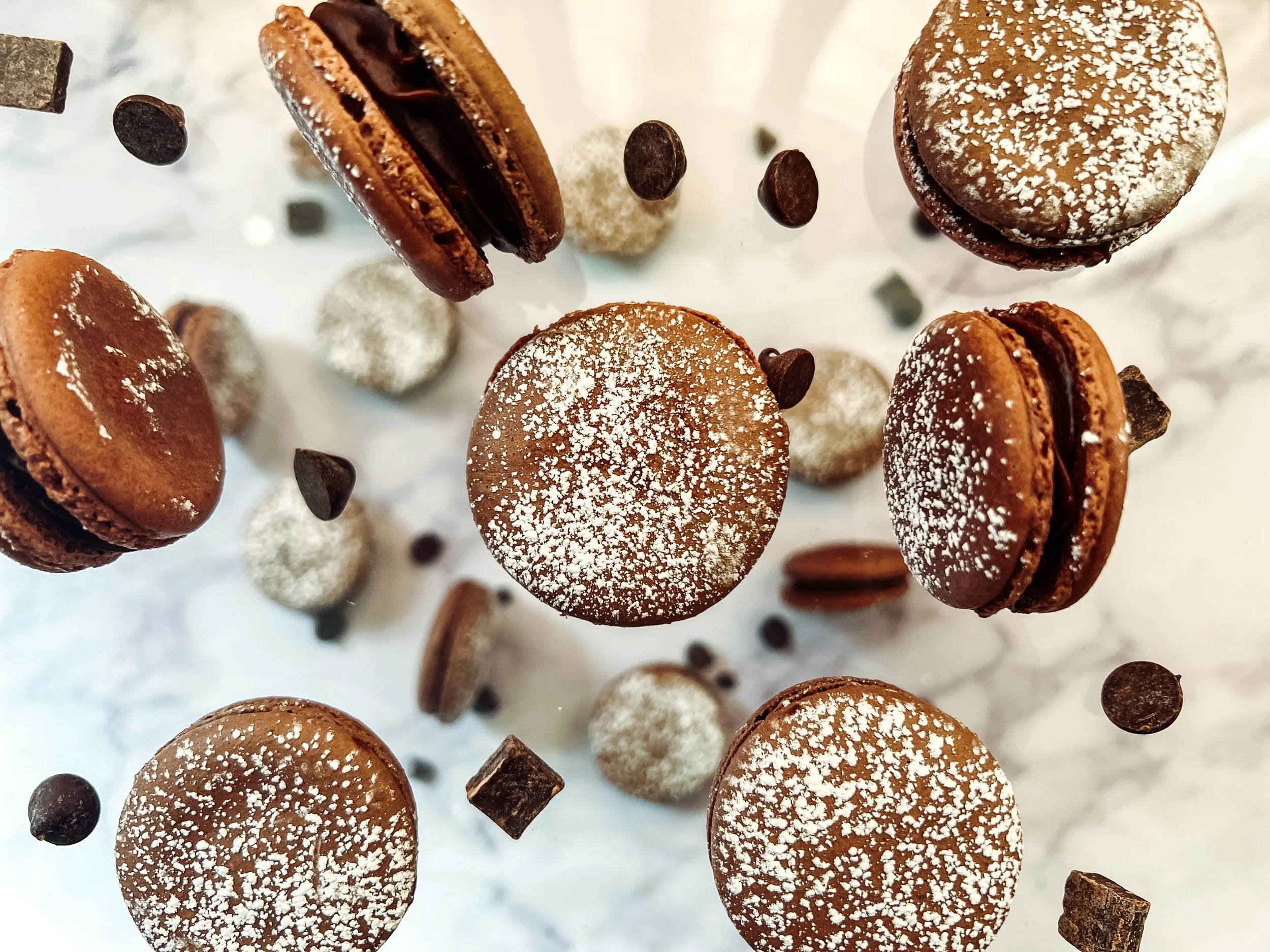 Chocolate macarons filled with chocolate buttercream and chocolate ganache, dusted with powdered sugar