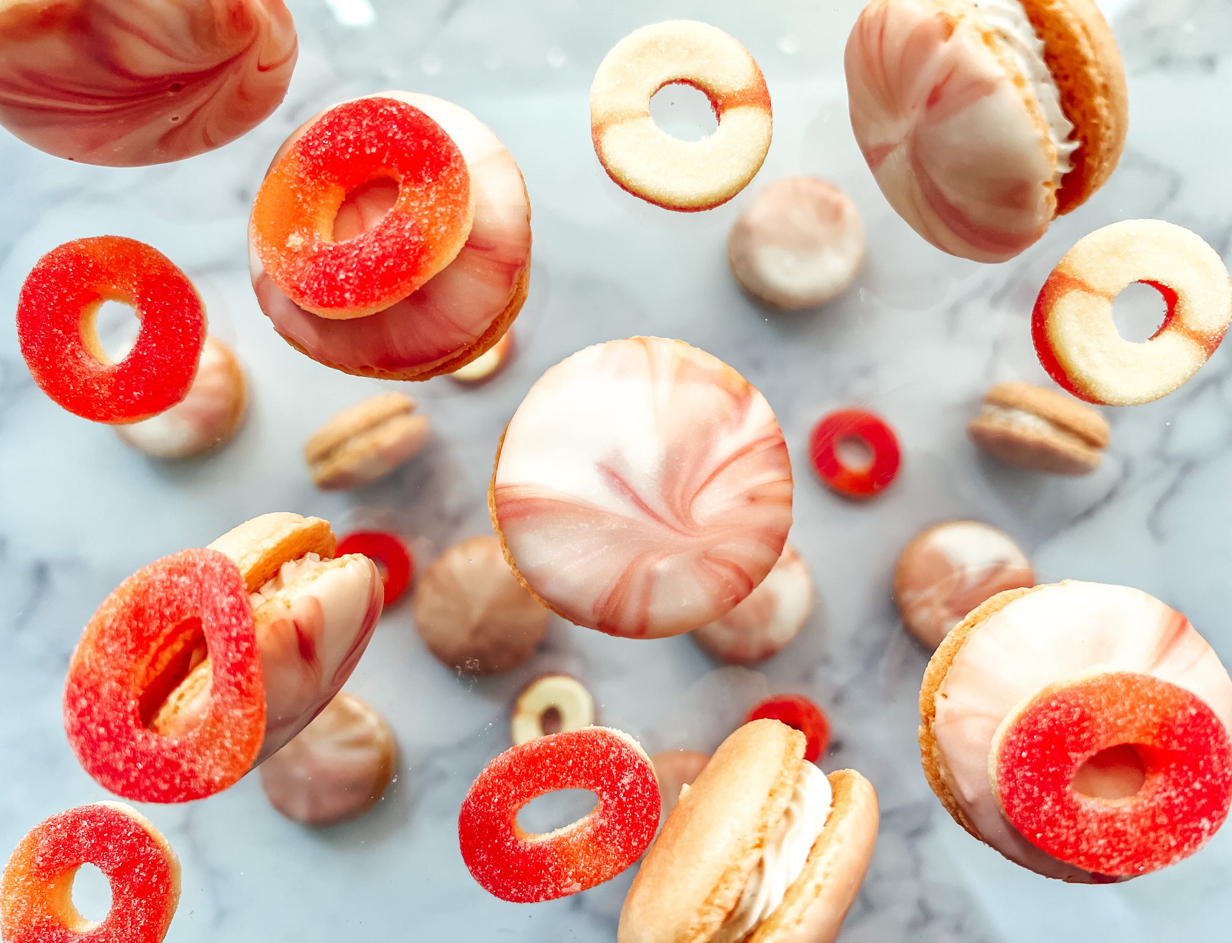 Raspberry macarons, filled with champagne white chocolate and seedless raspberry jam. Drizzled with white chocolate and sprinkled with organic freeze dried raspberry crumbles.