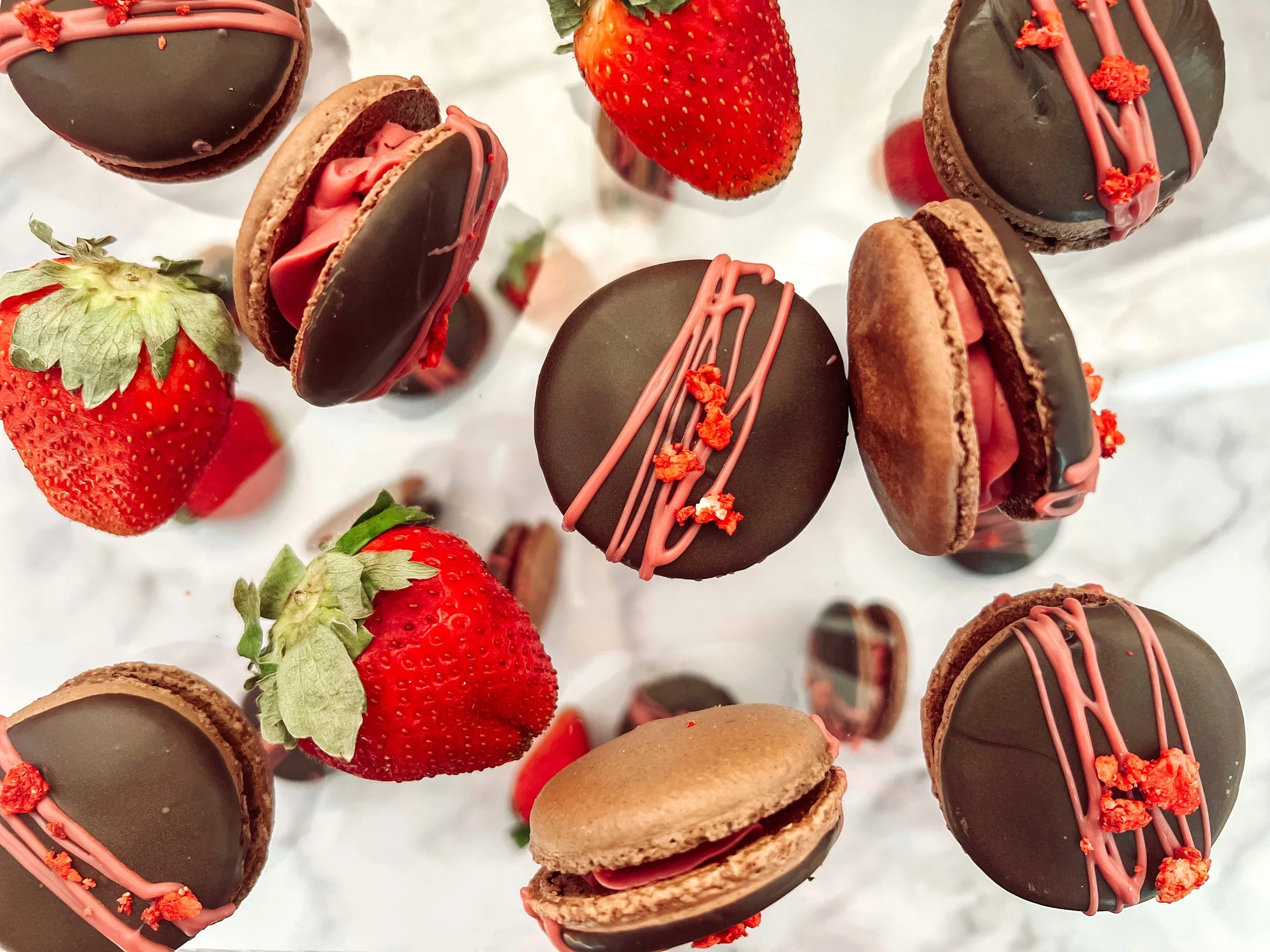 A chocolate macaron, filled with strawberry buttercream, dipped in Guittard dark chocolate, drizzled with Callebaut Ruby chocolate, and sprinkled with freeze dried strawberry crumbles.
