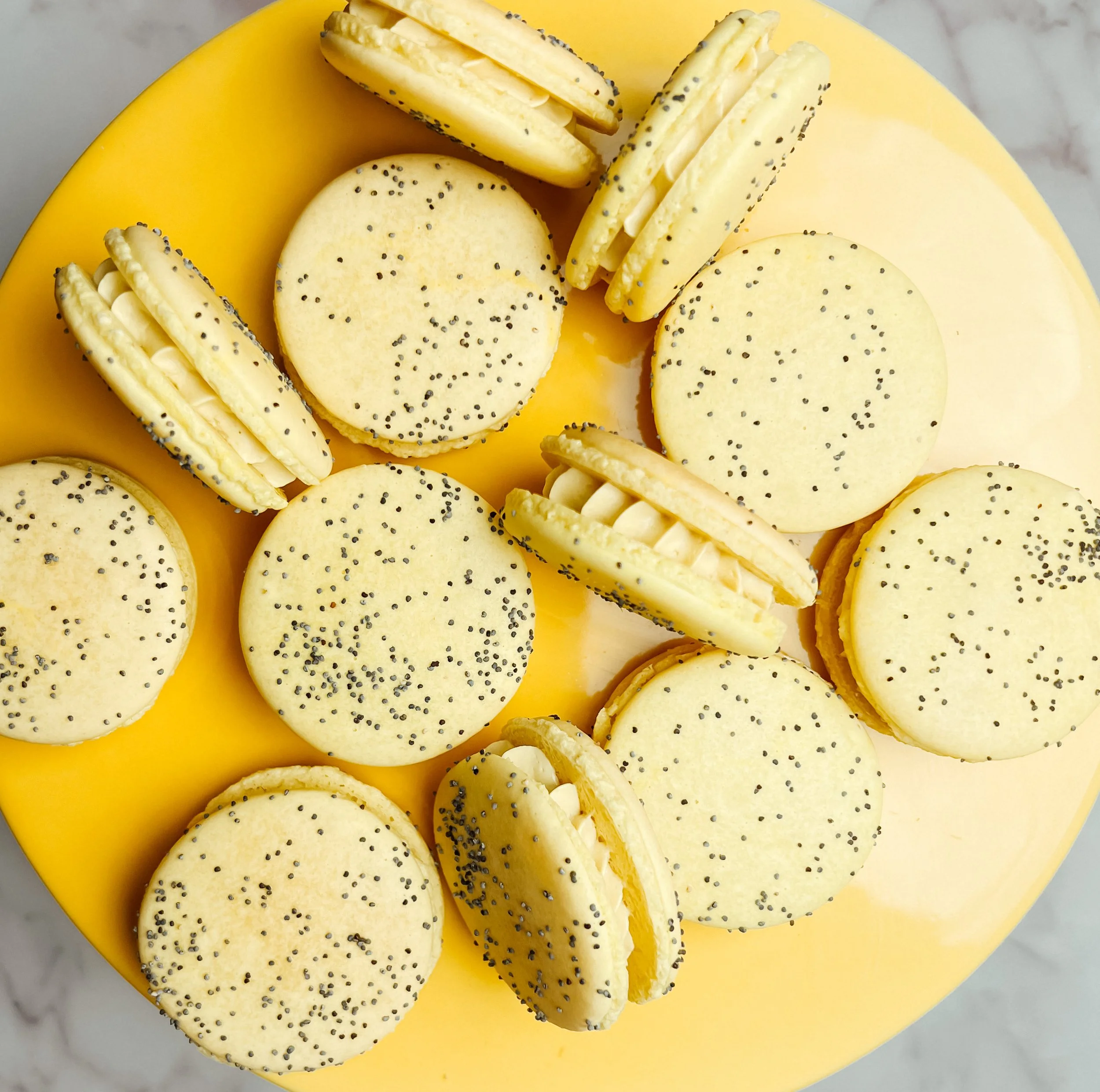 Lemon macarons, topped with poppyseeds. Filled with lemon cake-flavored buttercream.