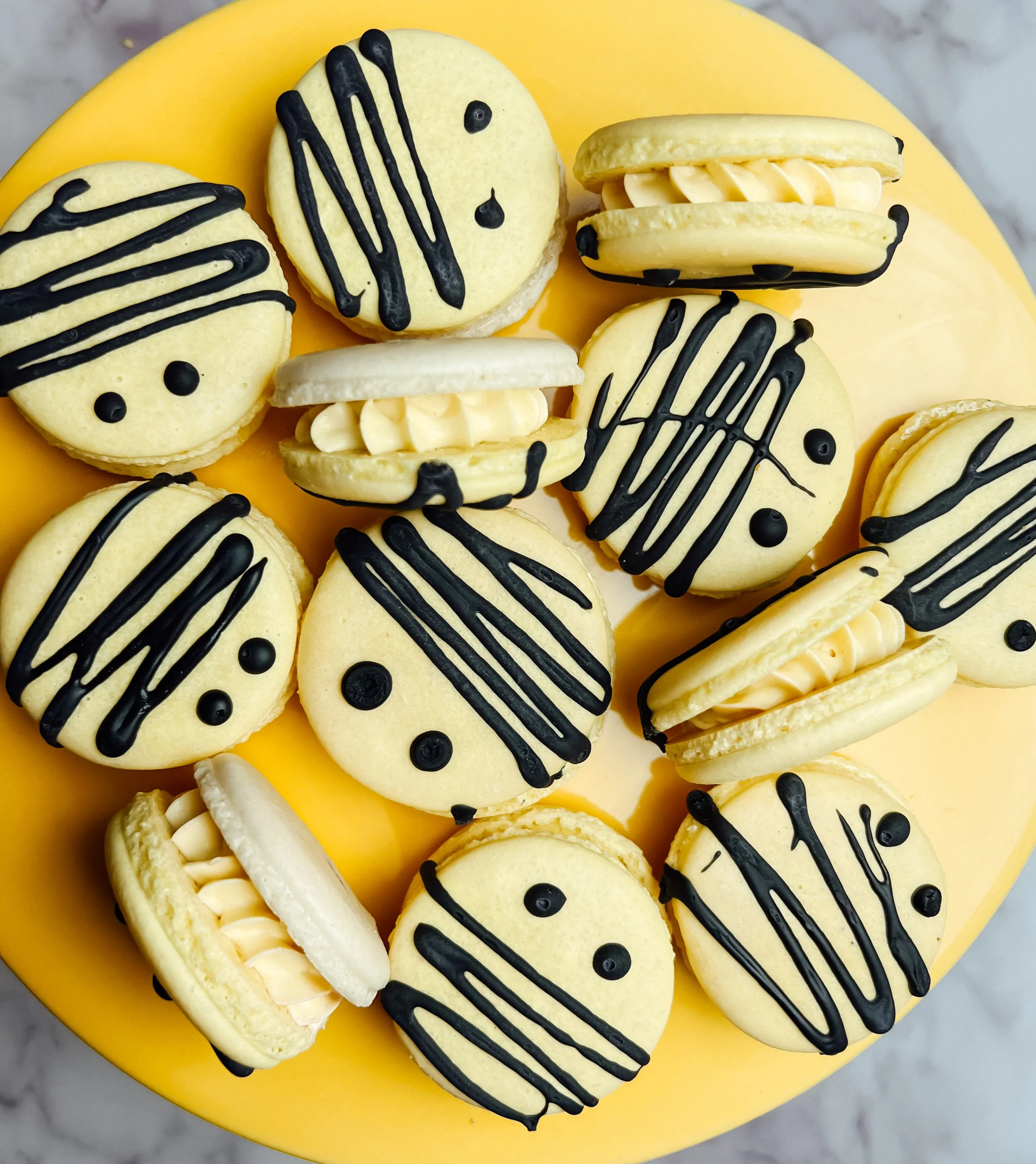 Macarons topped with honey-almond glaze, filled with honey buttercream.
