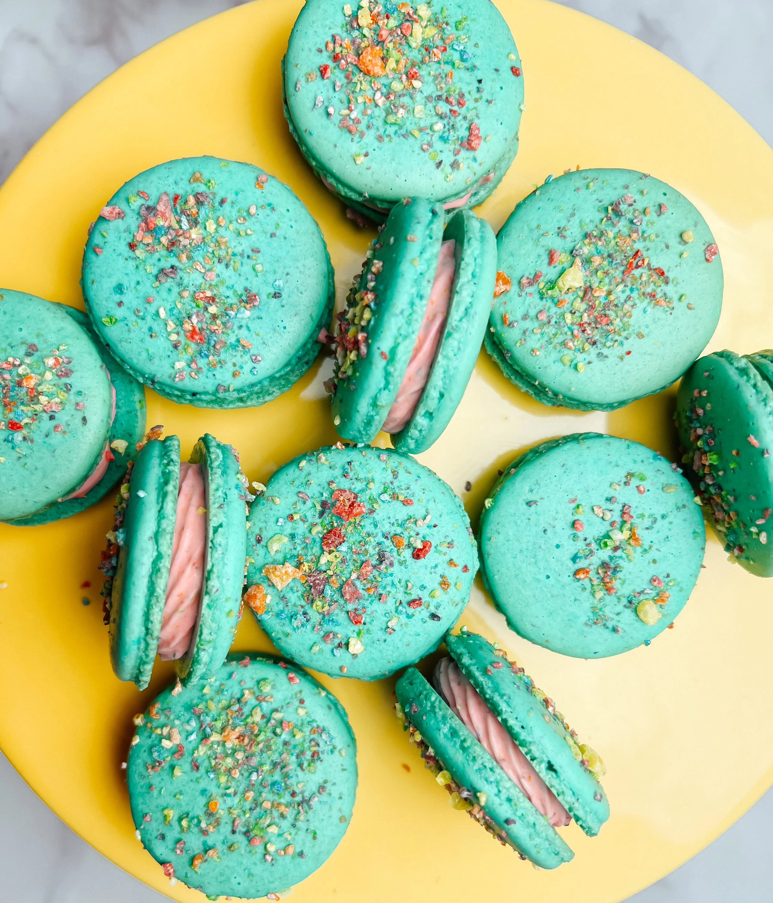 Macarons blended with Fruity Pebbles cereal, topped with Fruity Pebbles crumbles. Filled with Fruity Pebbles buttercream.