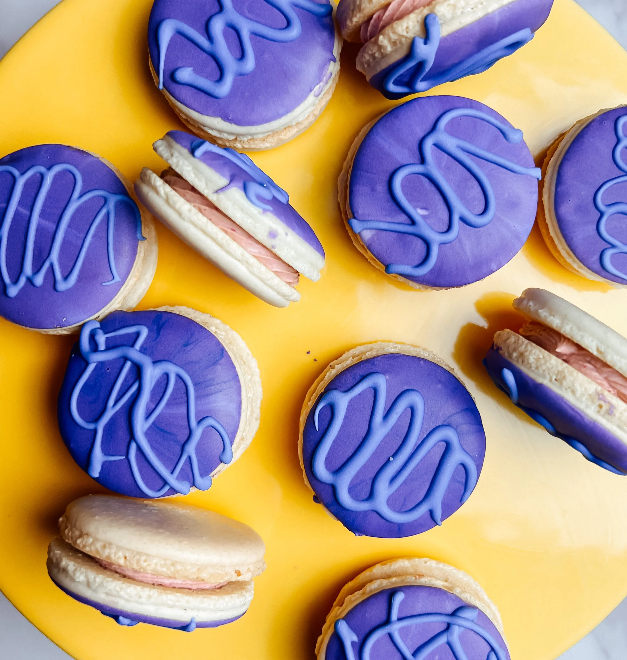 Macarons dipped in royal icing, filled with Wild Berry buttercream and fresh Wild Berry compote.