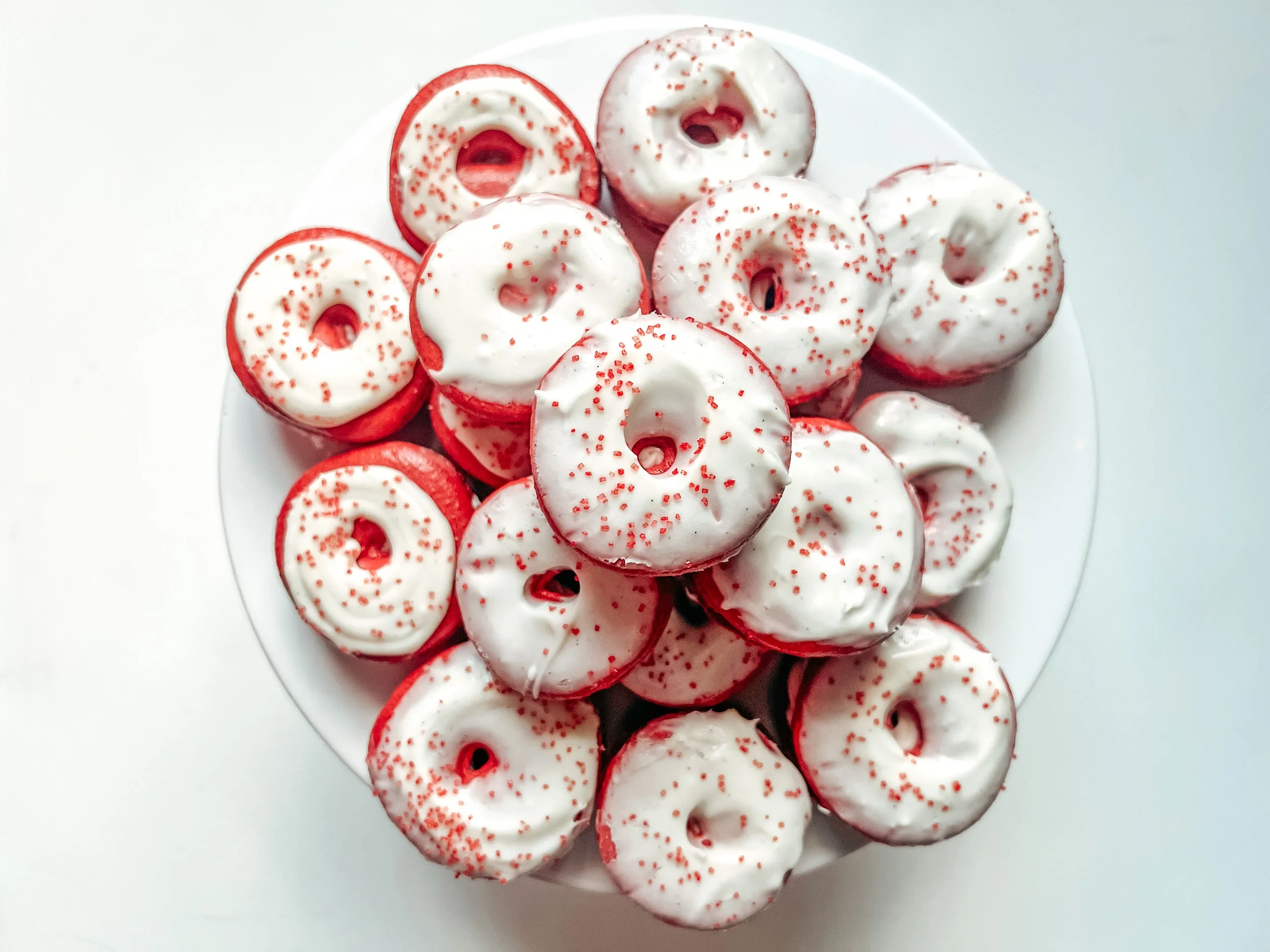 Red velvet flavored macarons, topped with cream cheese glaze, filled with red velvet cream cheese buttercream