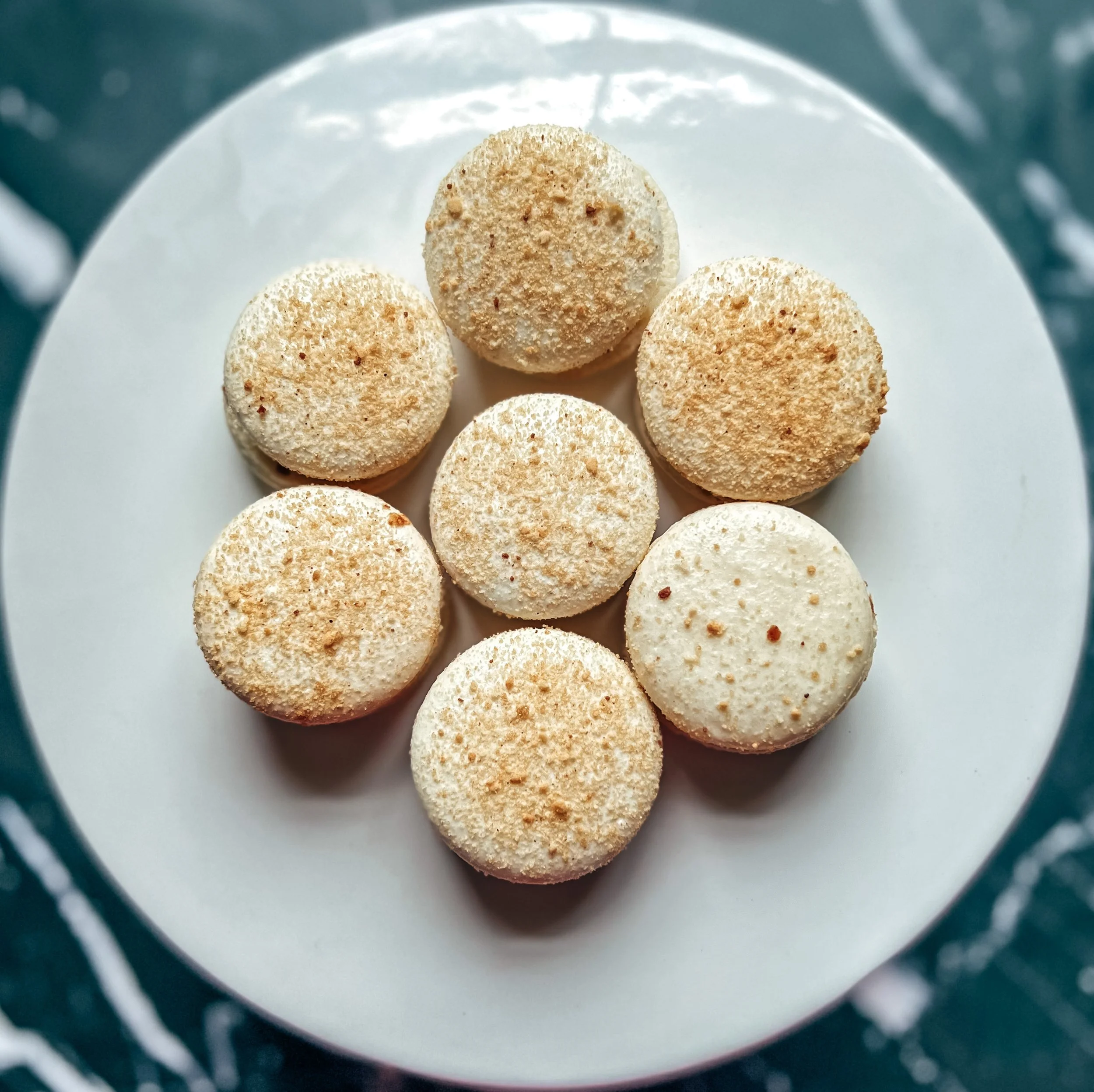 One vanilla macaron shell and one chocolate macaron shell, filled with black and white cookie butter