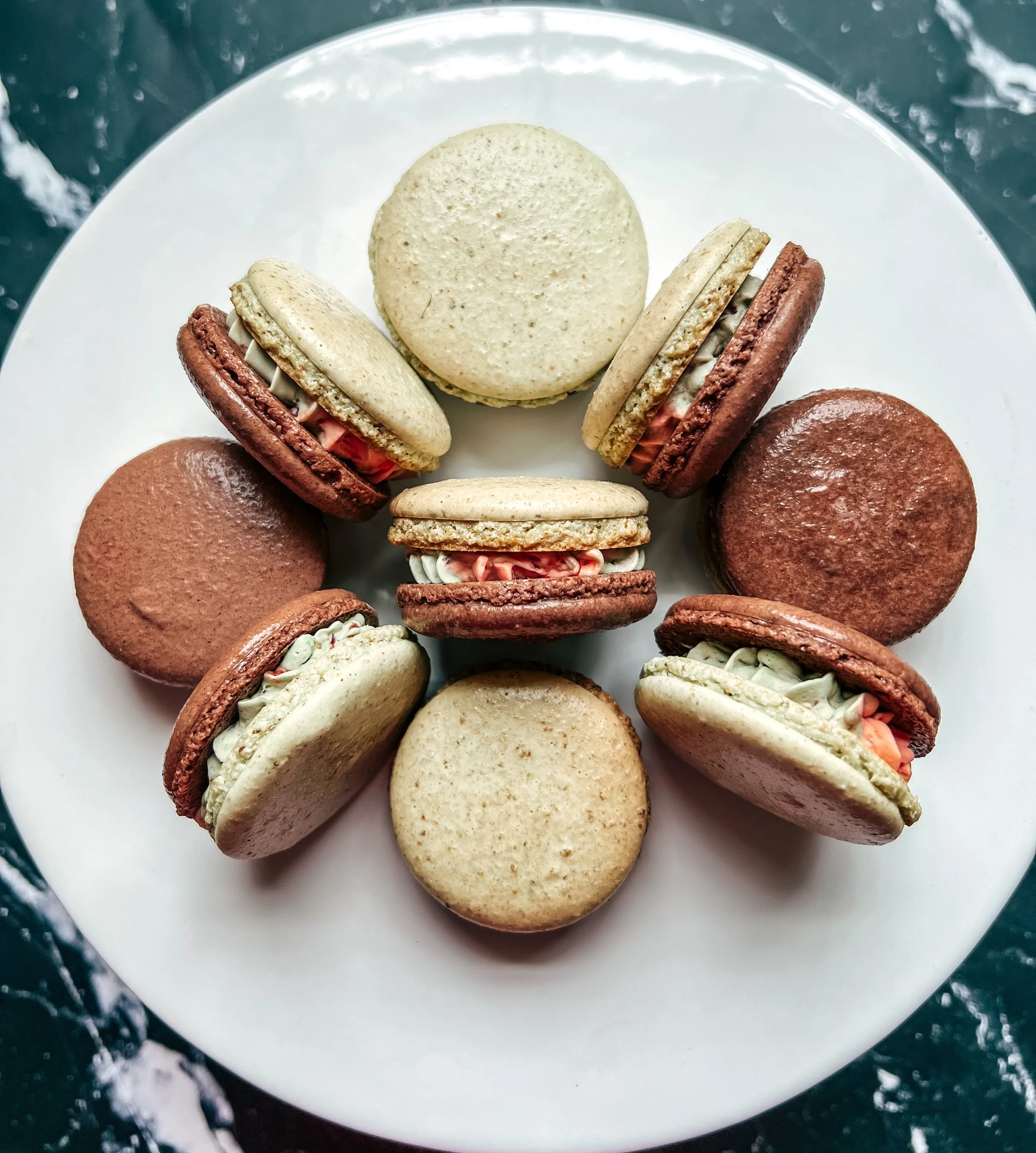 One pistachio macaron shell and one chocolate macaron shell, filled with rich, pistachio-cherry French buttercream.