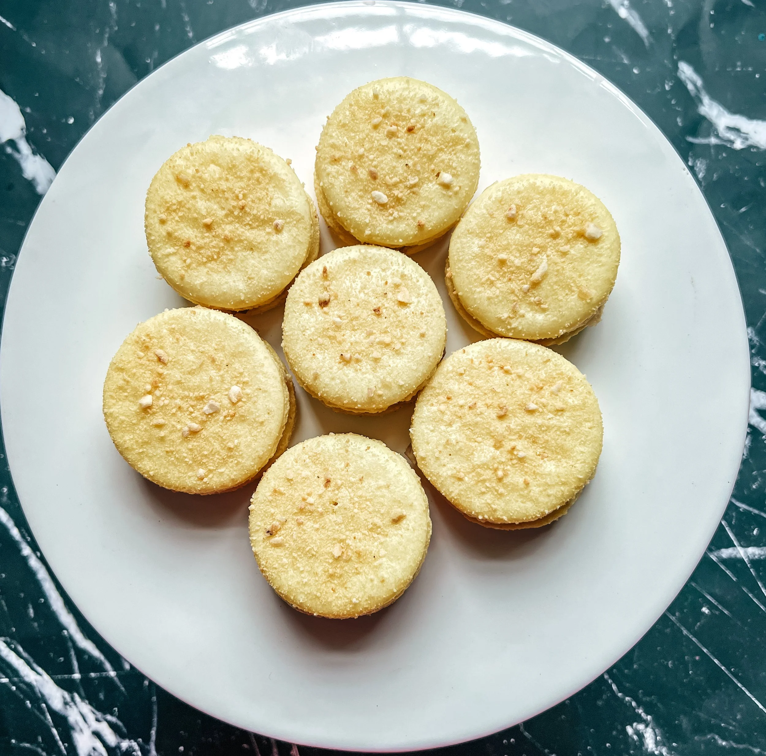 GF vanilla wafer flavored macarons, topped with GF vanilla wafer and banana chip crumbs and filled with vanilla French buttercream, bananas and GF vanilla wafers