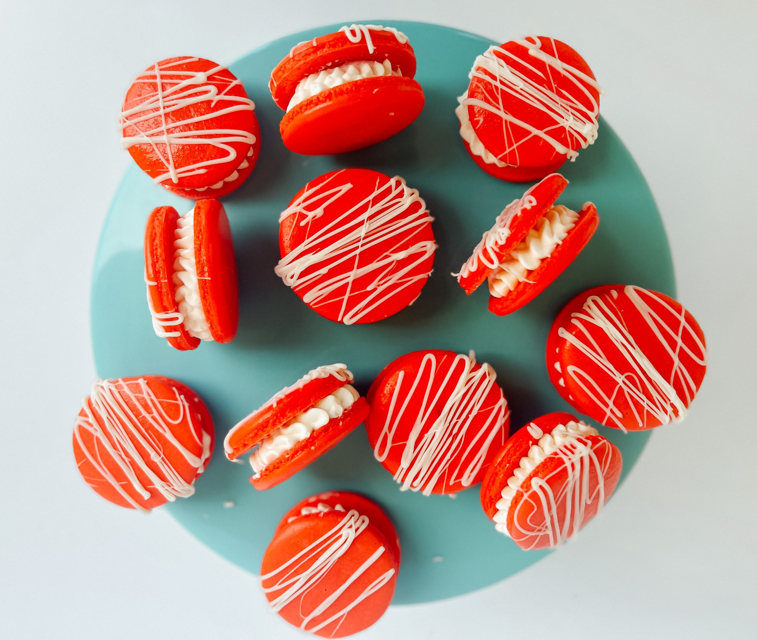 Cherry flavored macarons, filled with white chocolate buttercream and white chocolate cherry buttercream. Drizzled with white chocolate