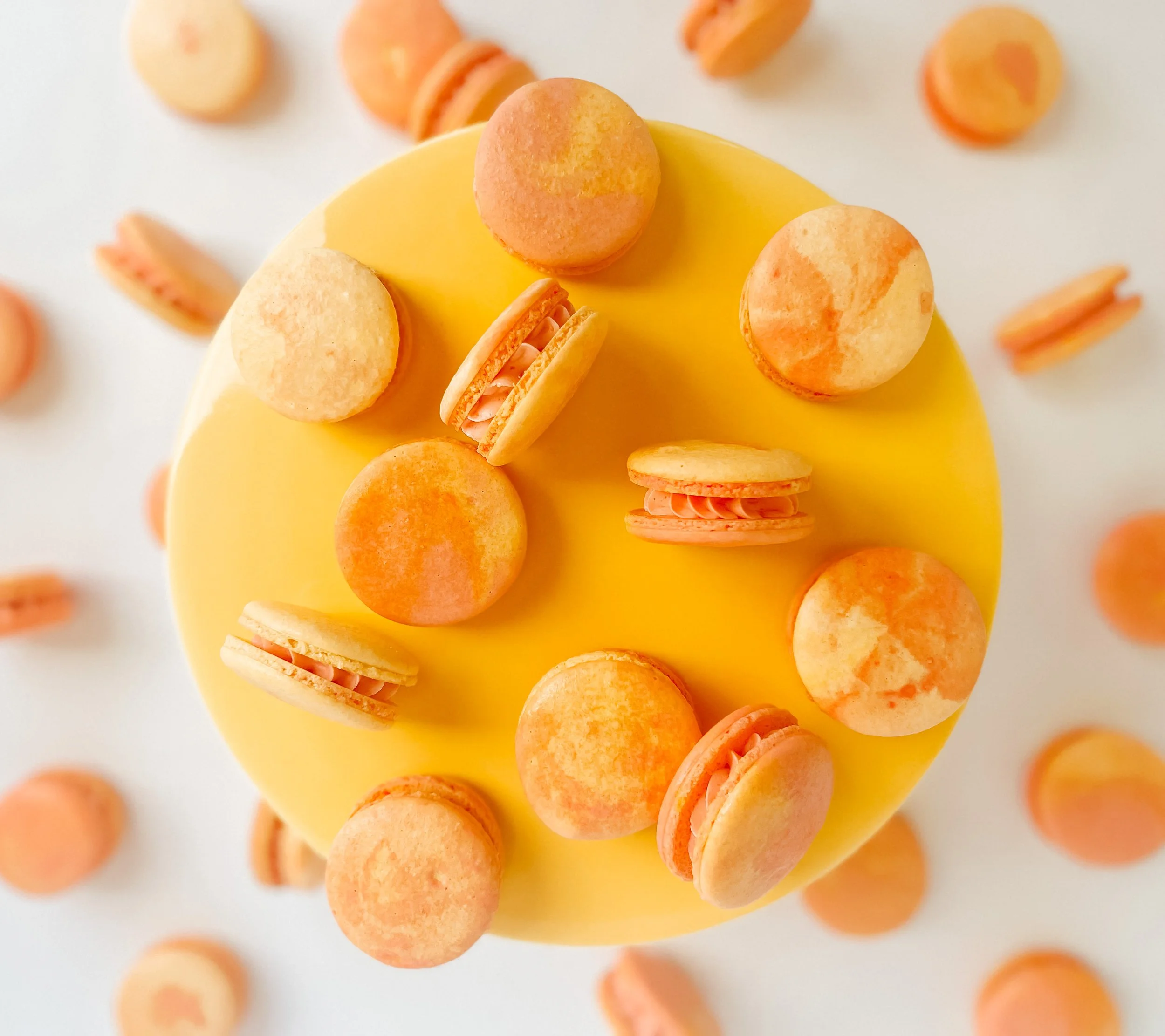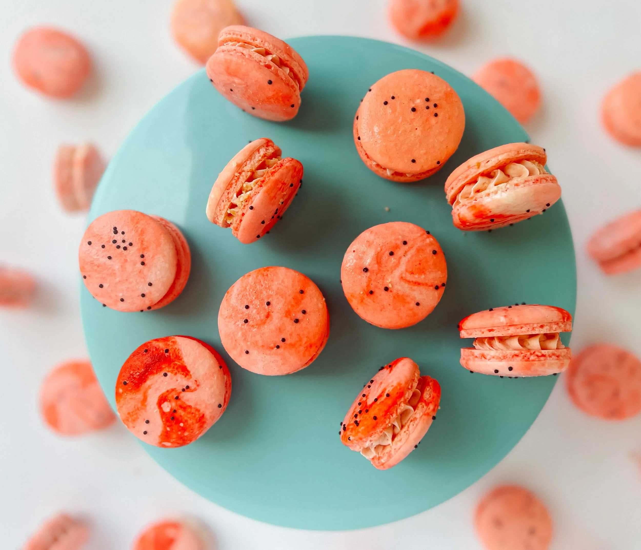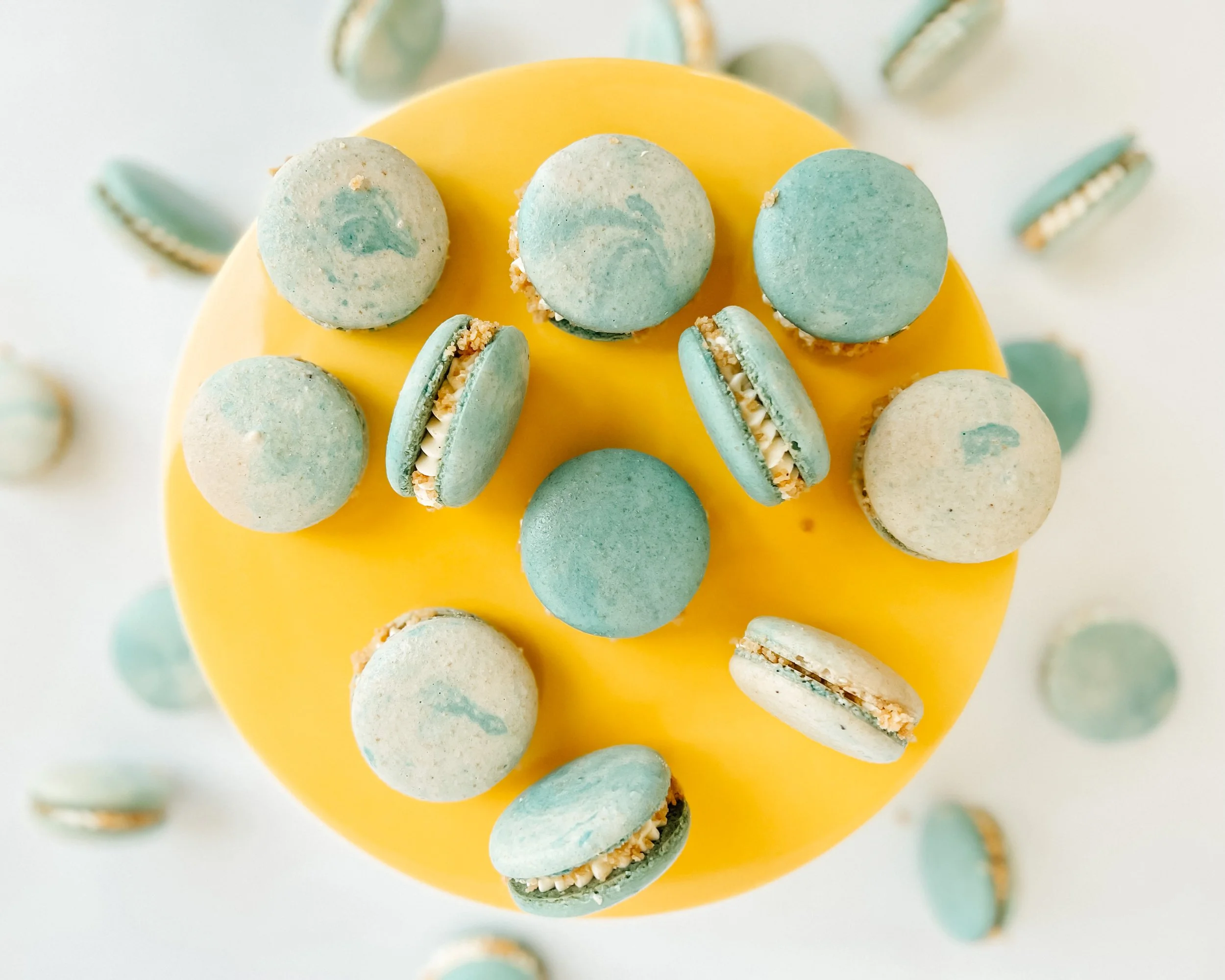 Cinnamon graham cracker-infused macaron shells, filled with cheesecake flavored buttercream and homemade blueberry jam. Rolled in graham cracker streusel.