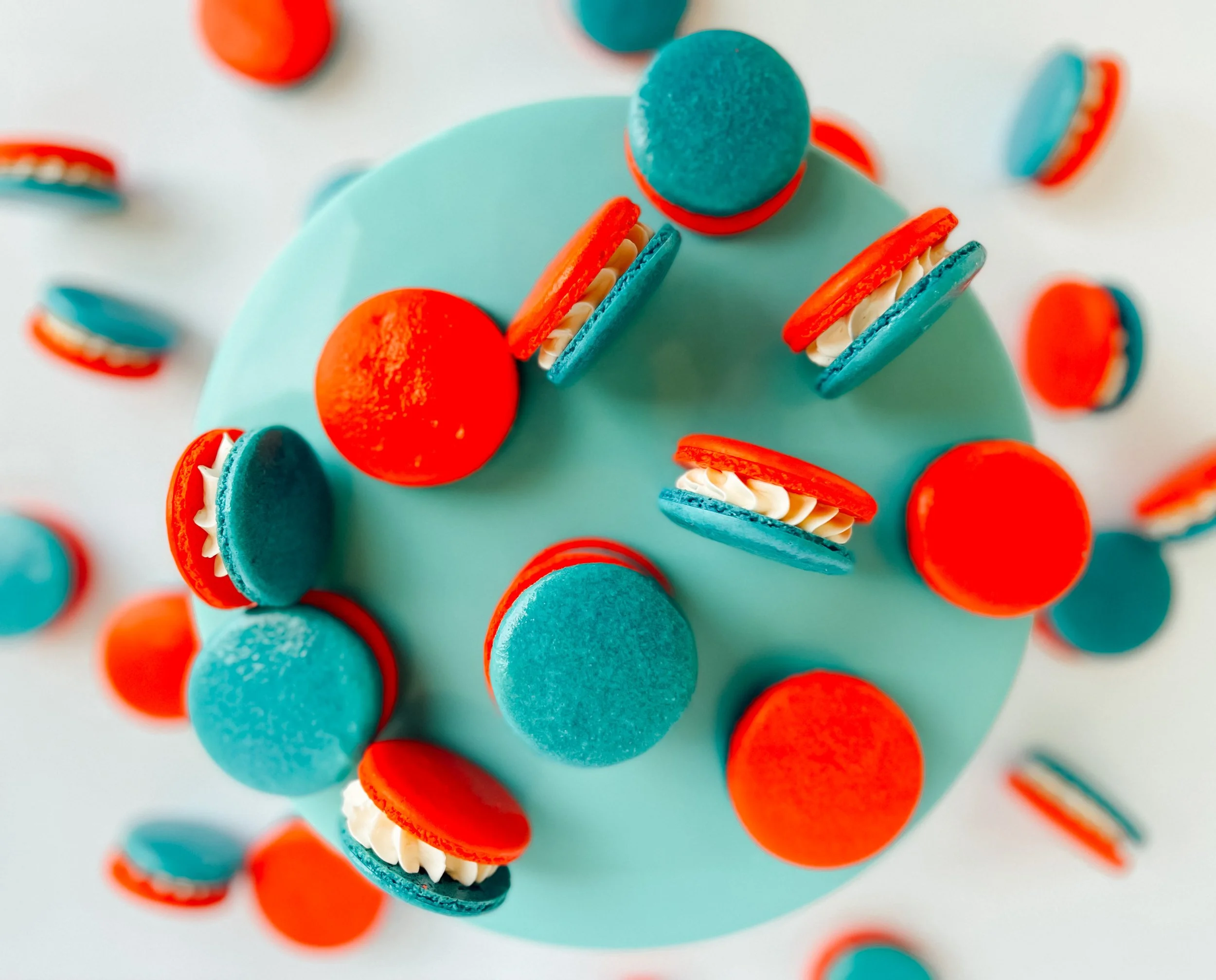 One blue raspberry flavored shell and one cherry flavored shell, filled with lime buttercream