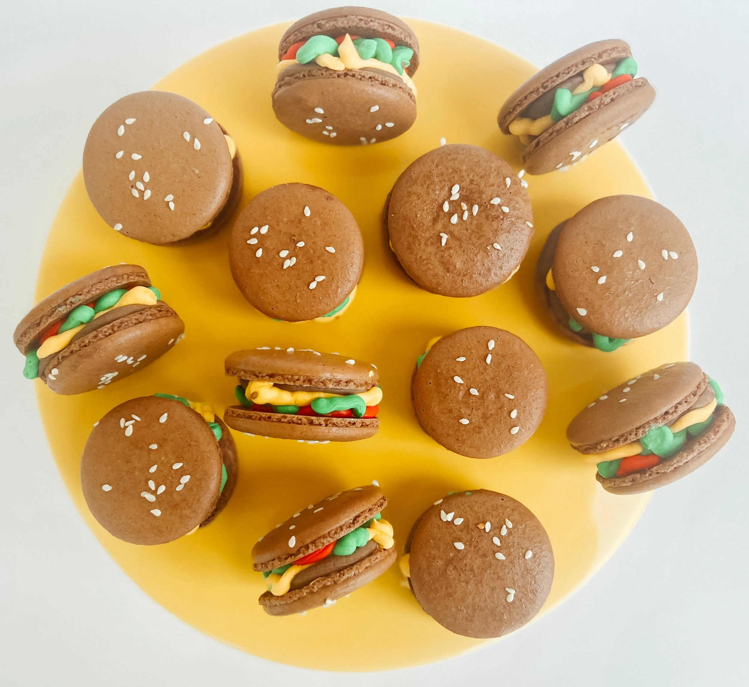 I unfortunately added too much cocoa powder to the macaron batter, so these “buns” look more like pretzel buns or maybe rye bread 🙄, but honestly is too much chocolate really a bad thing?