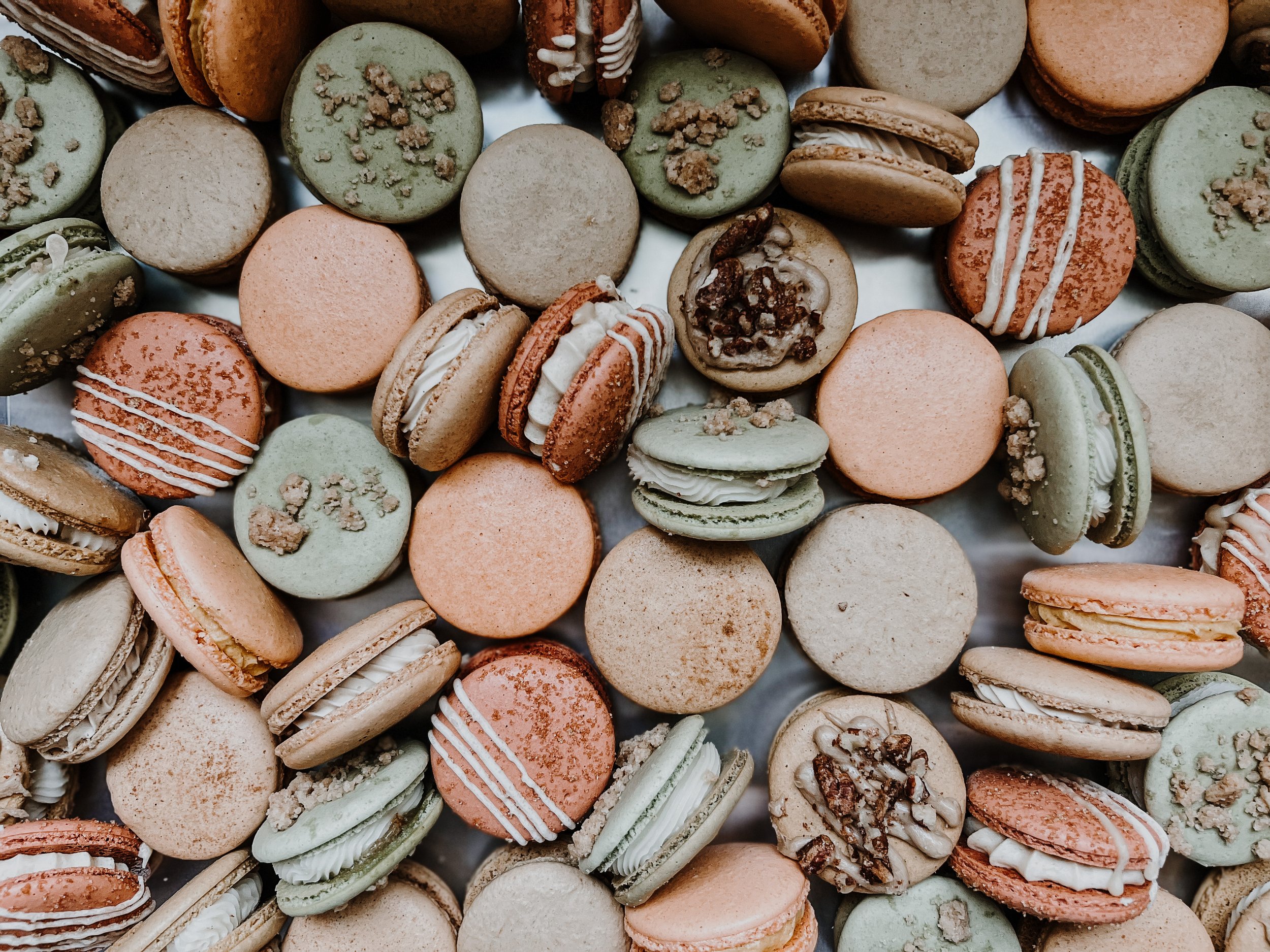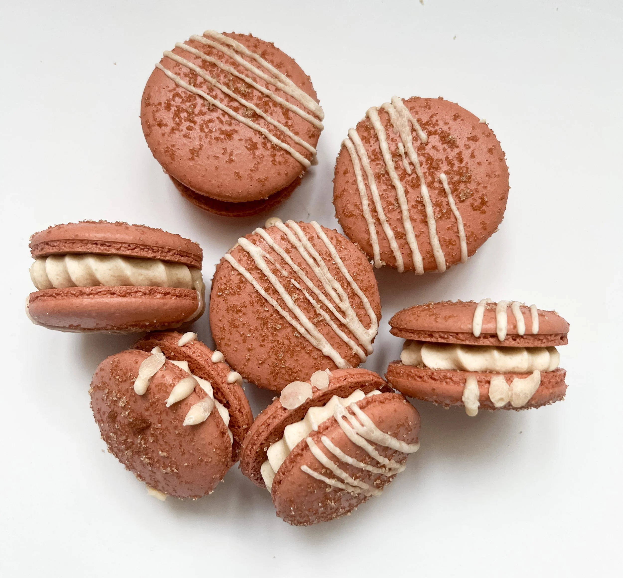 brown sugar maple flavored macarons, topped with brown sugar, filled with brown sugar buttercream, drizzled with maple brown sugar glaze