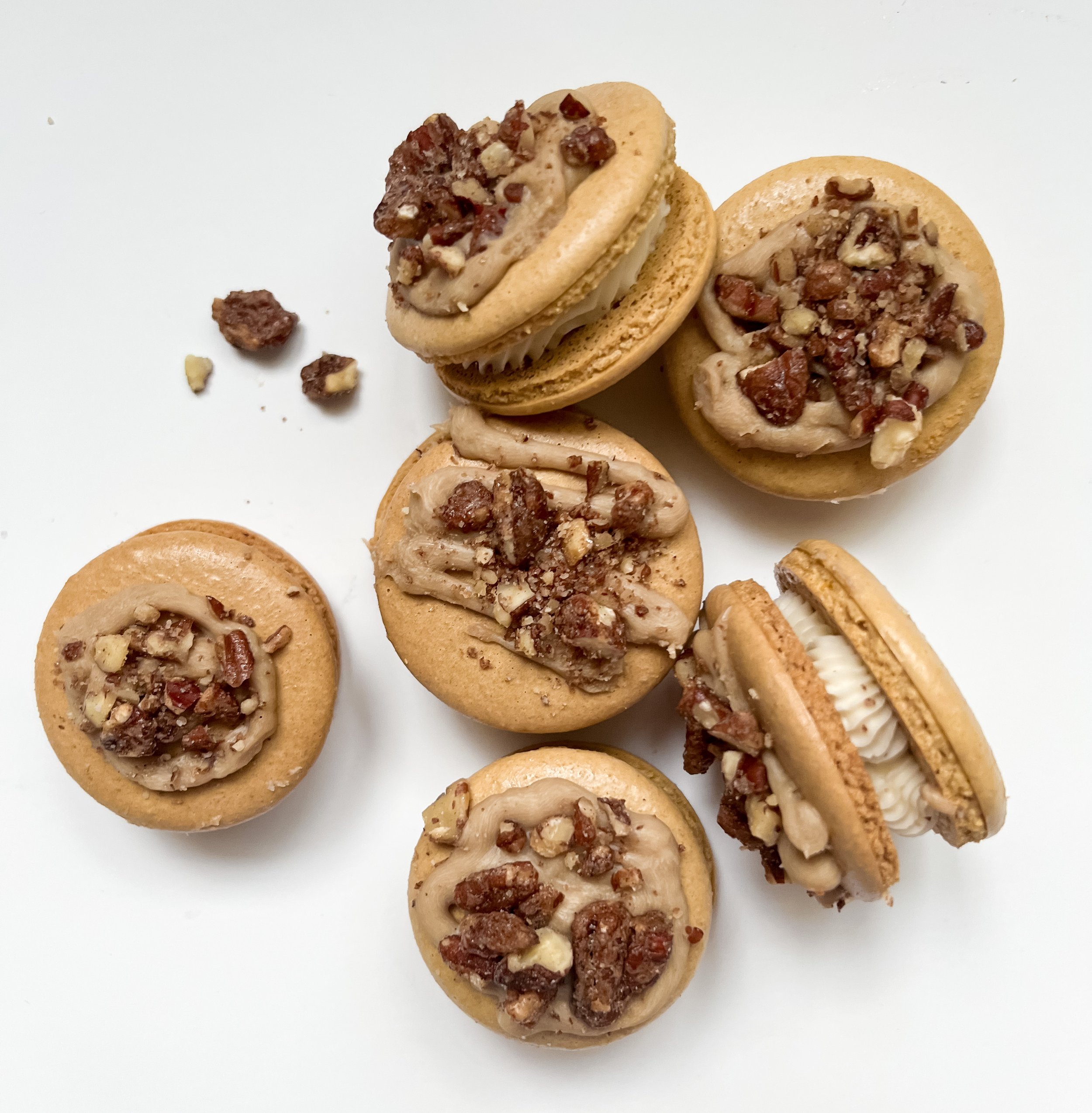 butter pecan flavored macarons, topped with butter pecan cream cheese glaze and pecan praline bits, filled with vanilla bean buttercream