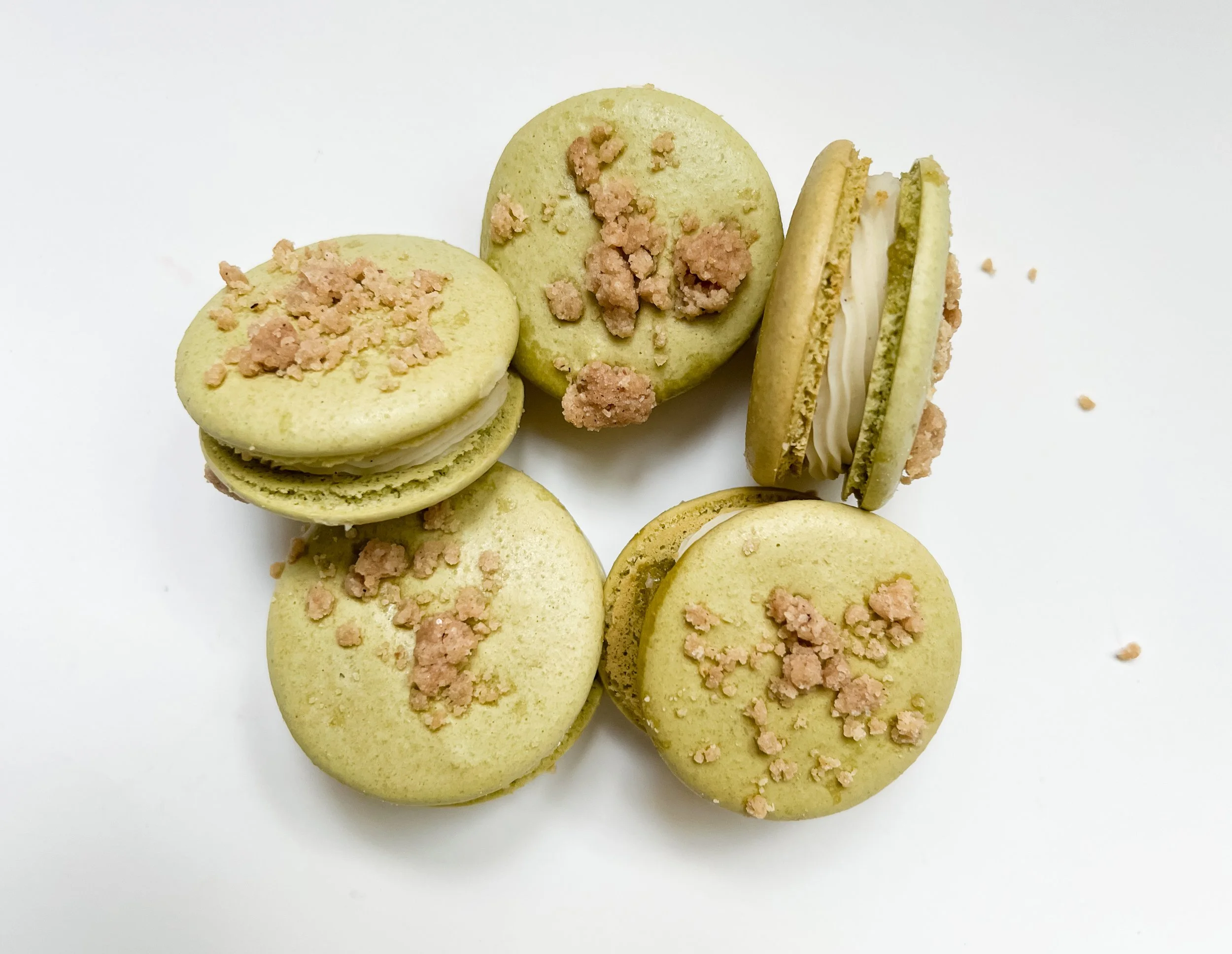 Apple spice flavored macarons, topped with apple cinnamon streusel, filled with vanilla buttercream and apple pie filling. These are really soft due to the apple pie filling, so pick them up carefully!